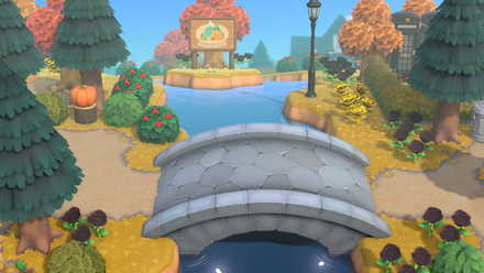 滝から斜め横に川が伸びており、川にかかる橋がマイデザインで表現されています。橋の数が足りない時や、自分の島に合った橋を掛けたい時にも使えるおしゃれな島クリ術です。