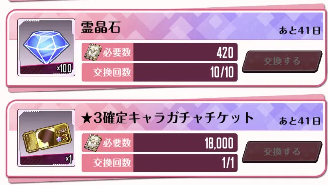 優先度:高 純白の誓約ではじめてのホットケーキを交換 優先度:中 開戦の狼煙を周回してガチャチケットを交換 優先度:中 強者との邂逅をクリアして霊晶石を大量入手 |
