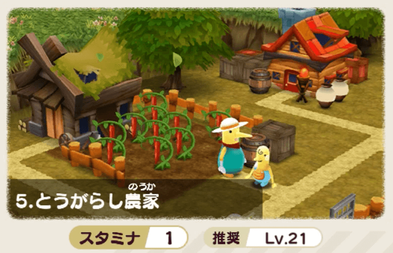 スタミナ無限チケットを最短で入手できるのは、冒険5のとうがらし農家です。道中に出現するはなもぐらから低確率でドロップするので、欲しい場合は根気よく周回する必要があります。