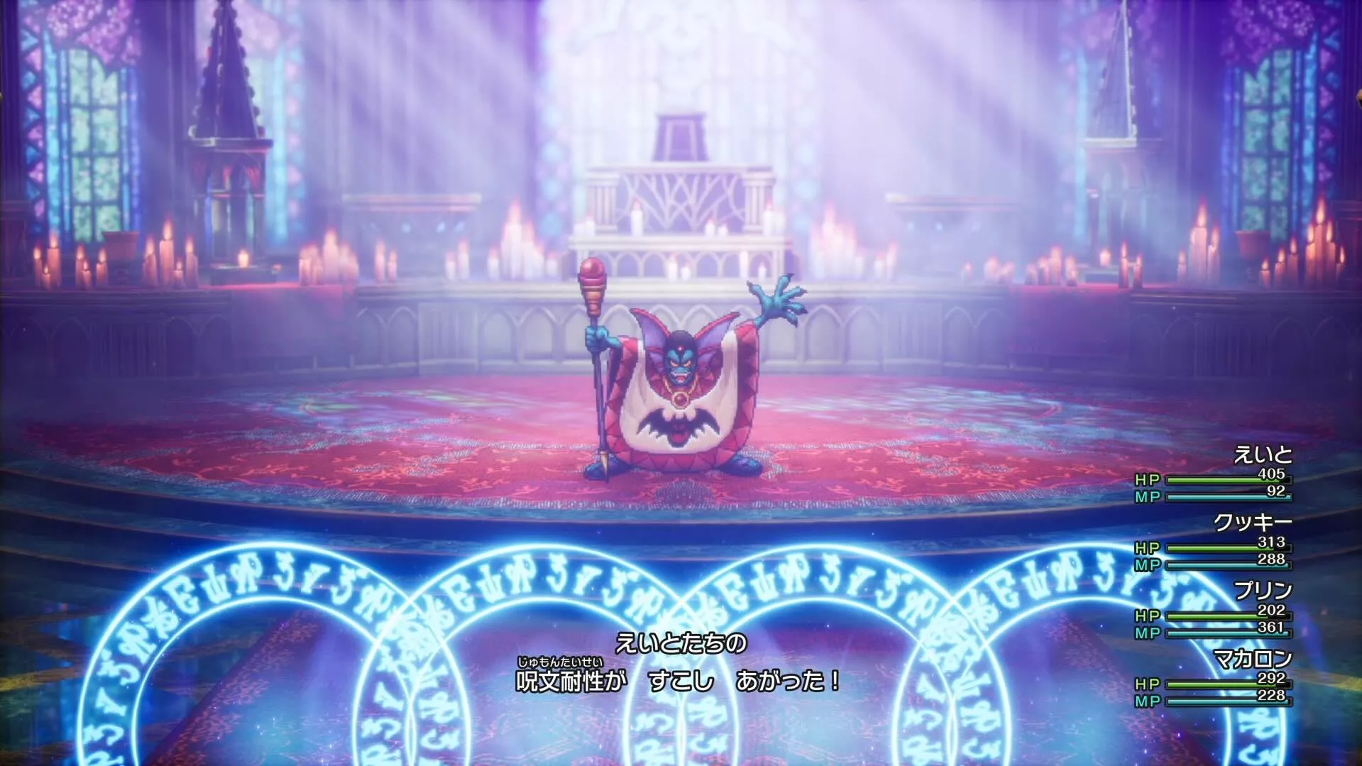 ハーゴンは強力な全体呪文や、痛恨の一撃などの物理攻撃を使用してきます。妖精たちのポルカだけでは耐久が厳しいため、マジックバリアとスクルトは常に維持するように意識しましょう。