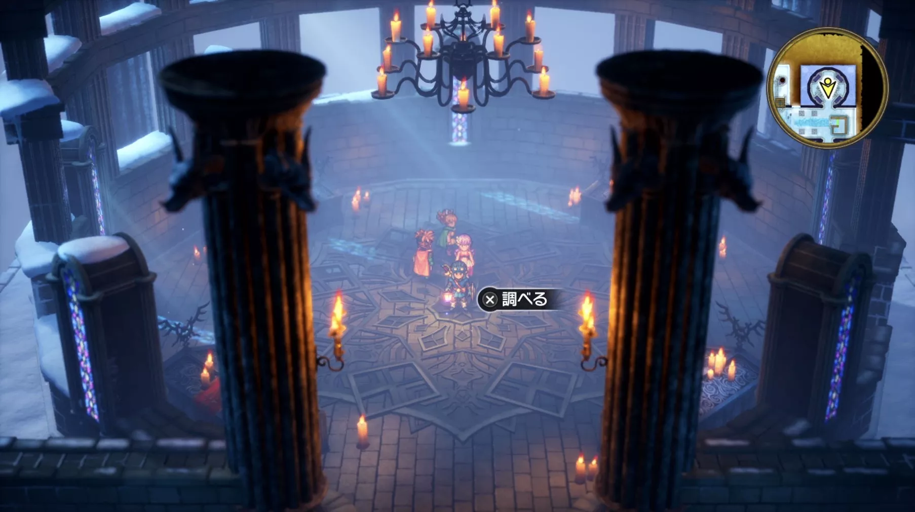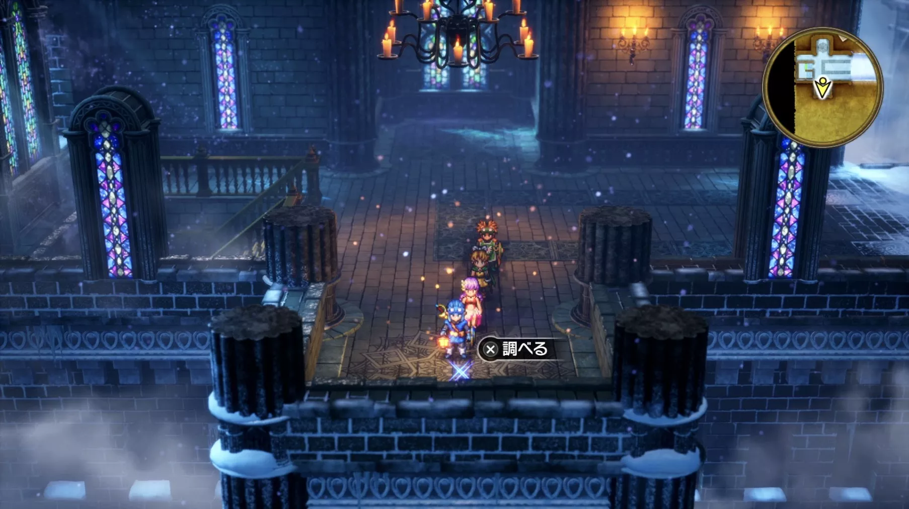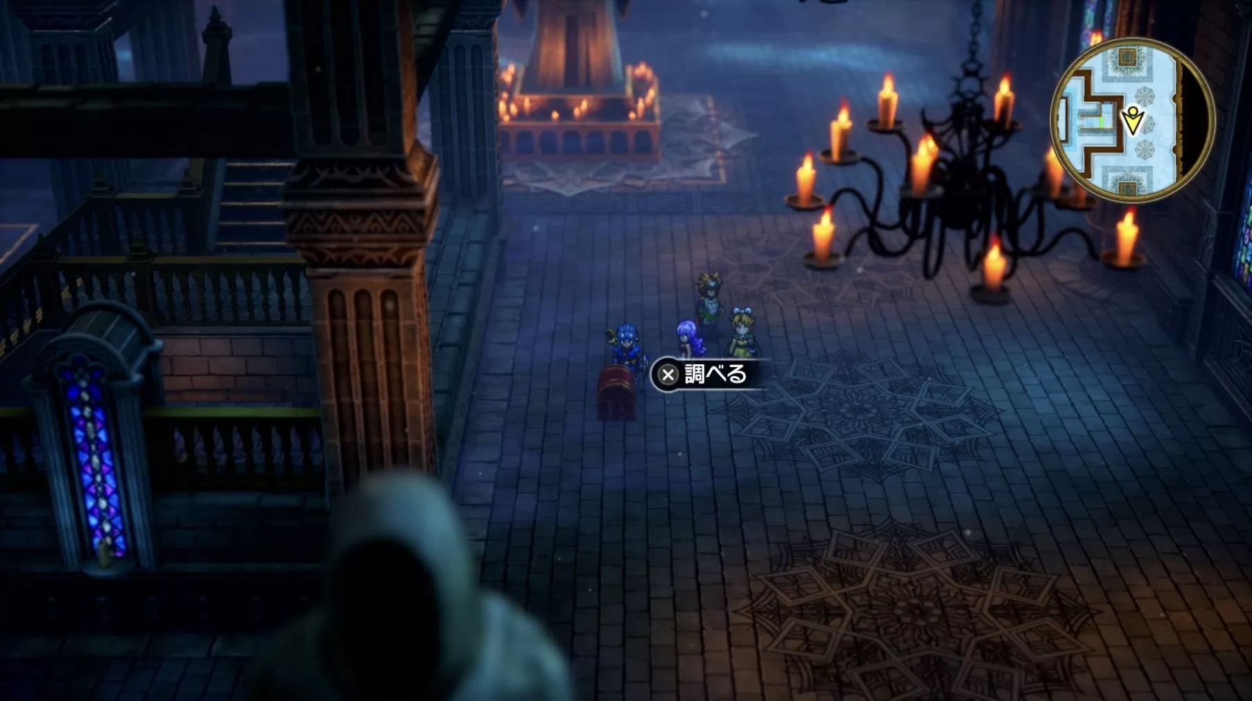 ボス戦後、ハーゴンの神殿・1階を北に進み、左から2番目のステンドグラスを通り抜けましょう。手前にある青い床は乗るとダメージを受けてしまうので、乗る前に必ず「トラマナ」を使用しましょう。