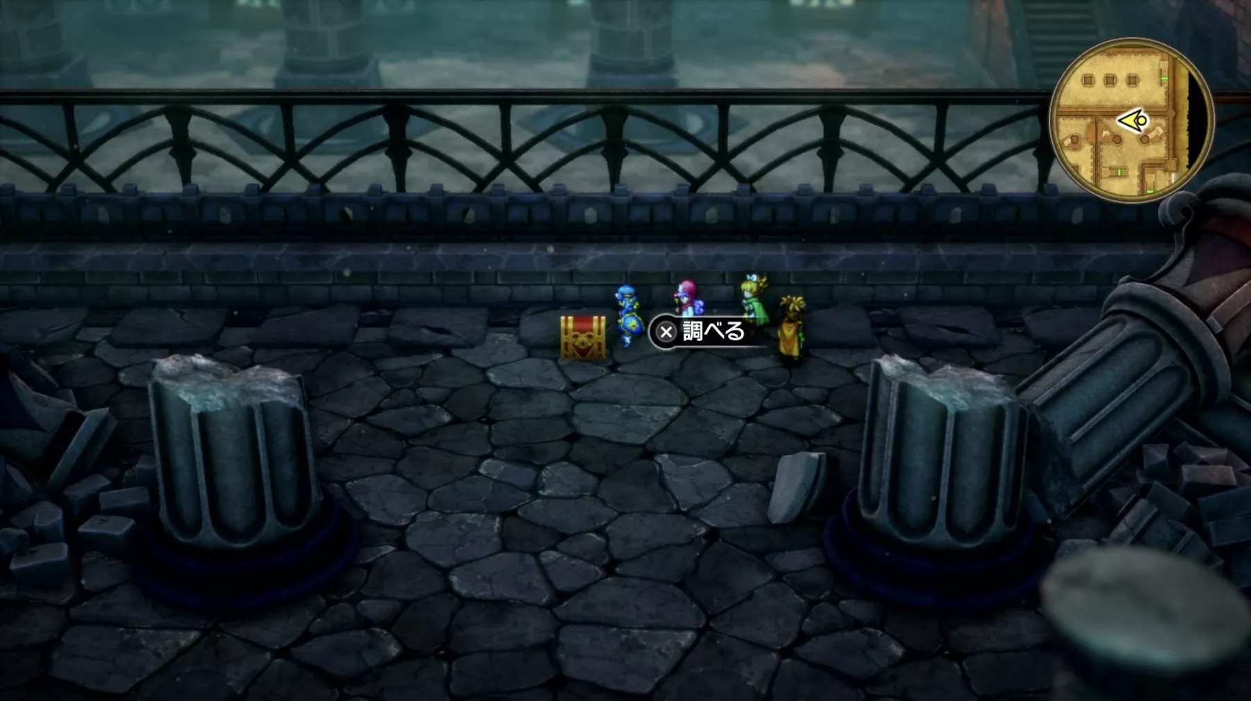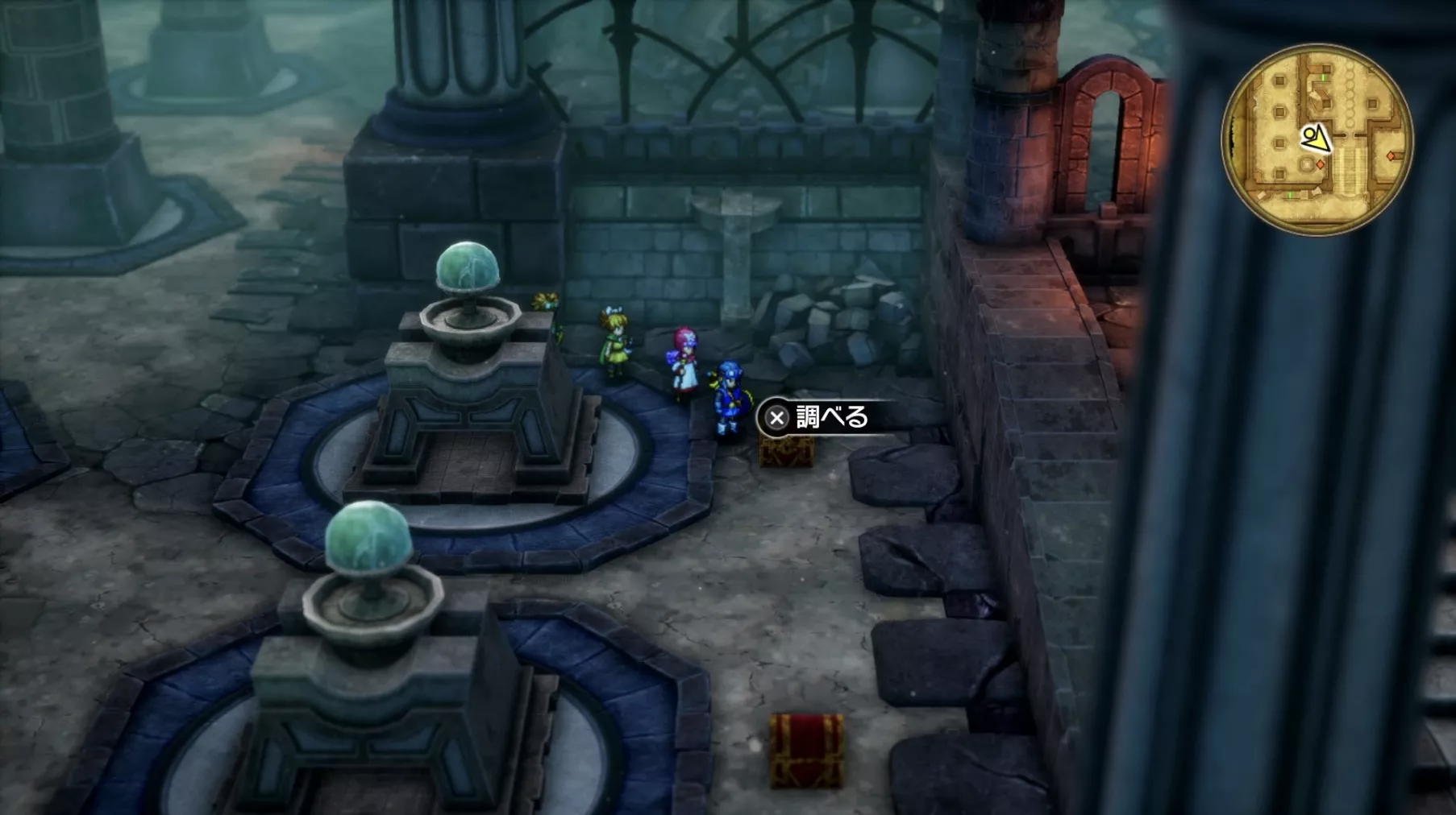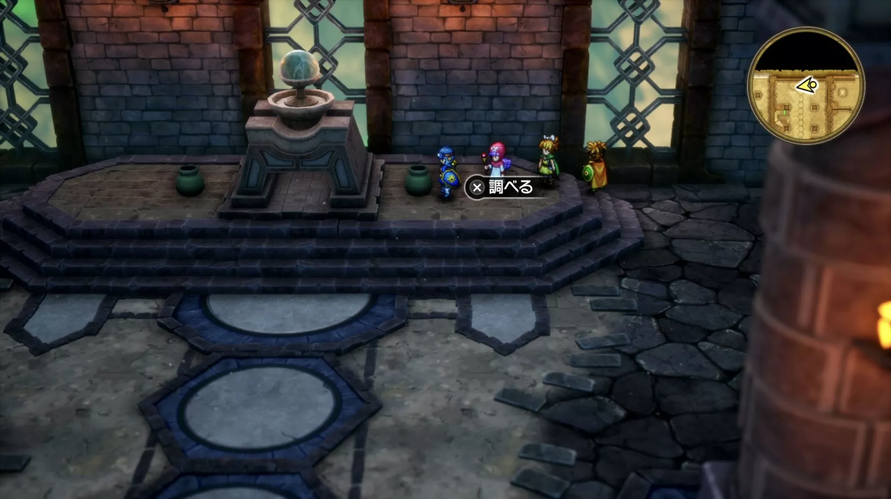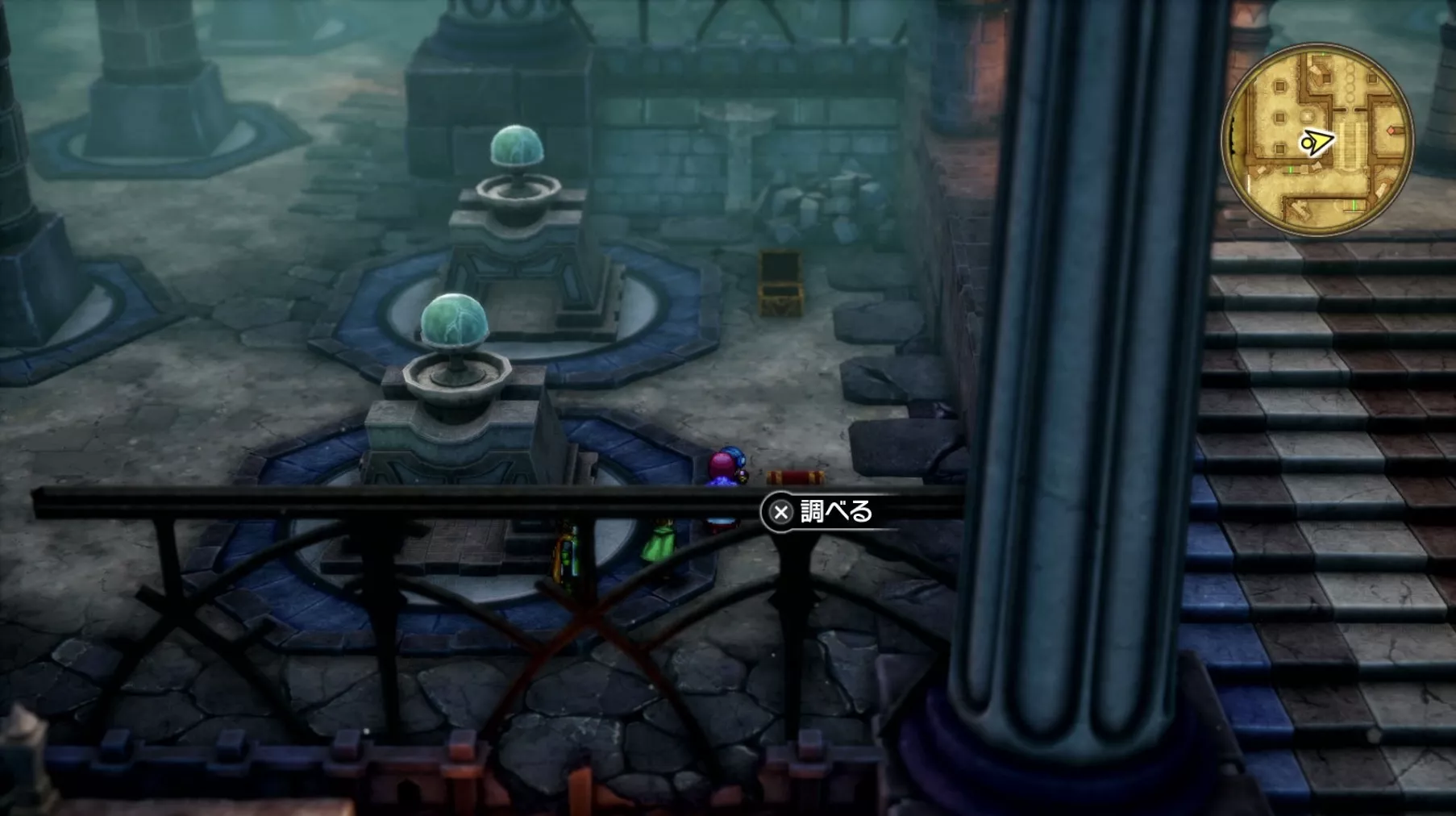 一階の階段が四つあるエリア。聖水がある左右対称の左側の模様ににおい袋が3つありますが、写真には掲載されていません。追記願います