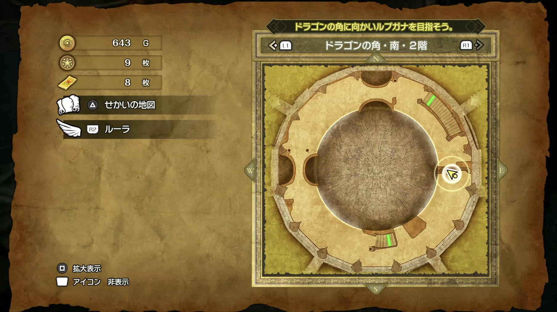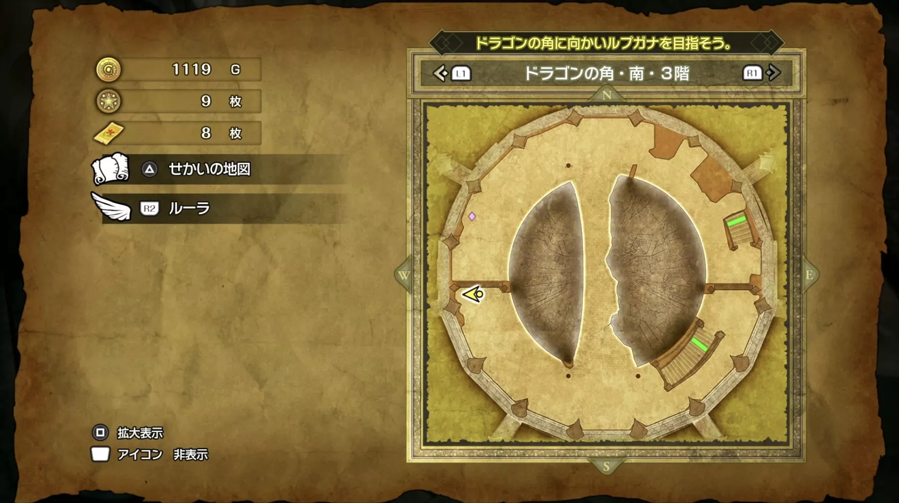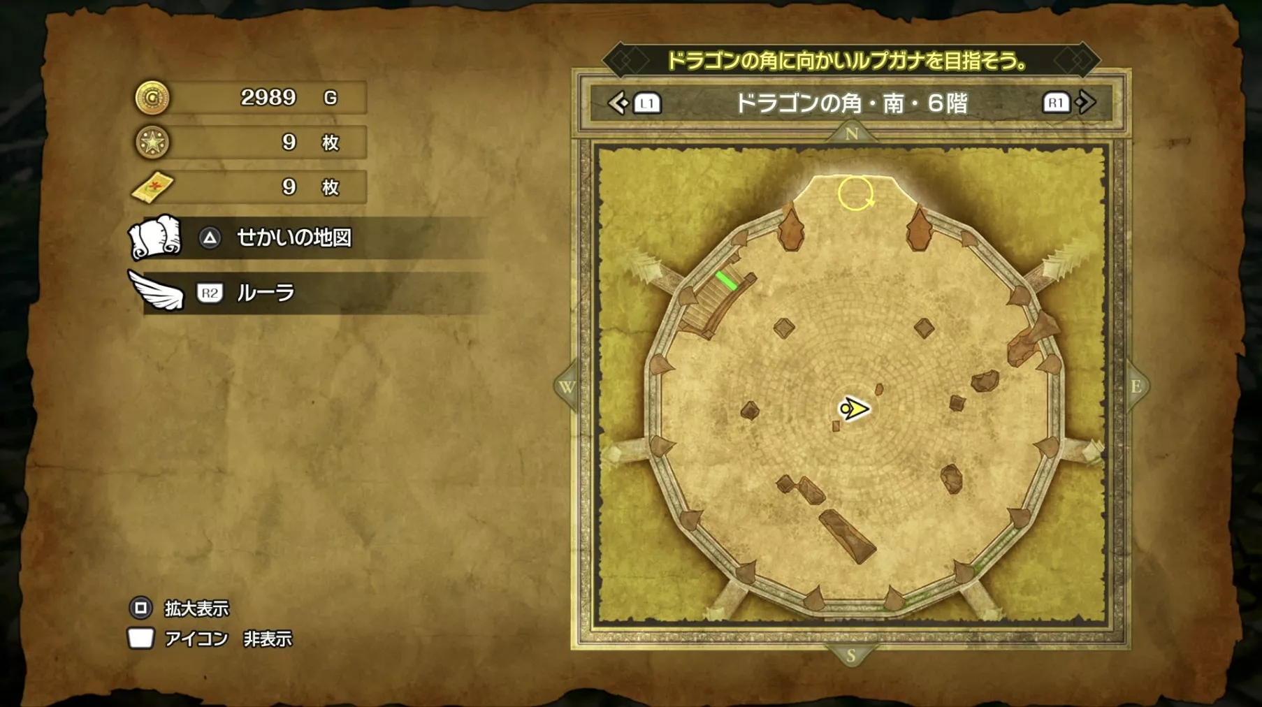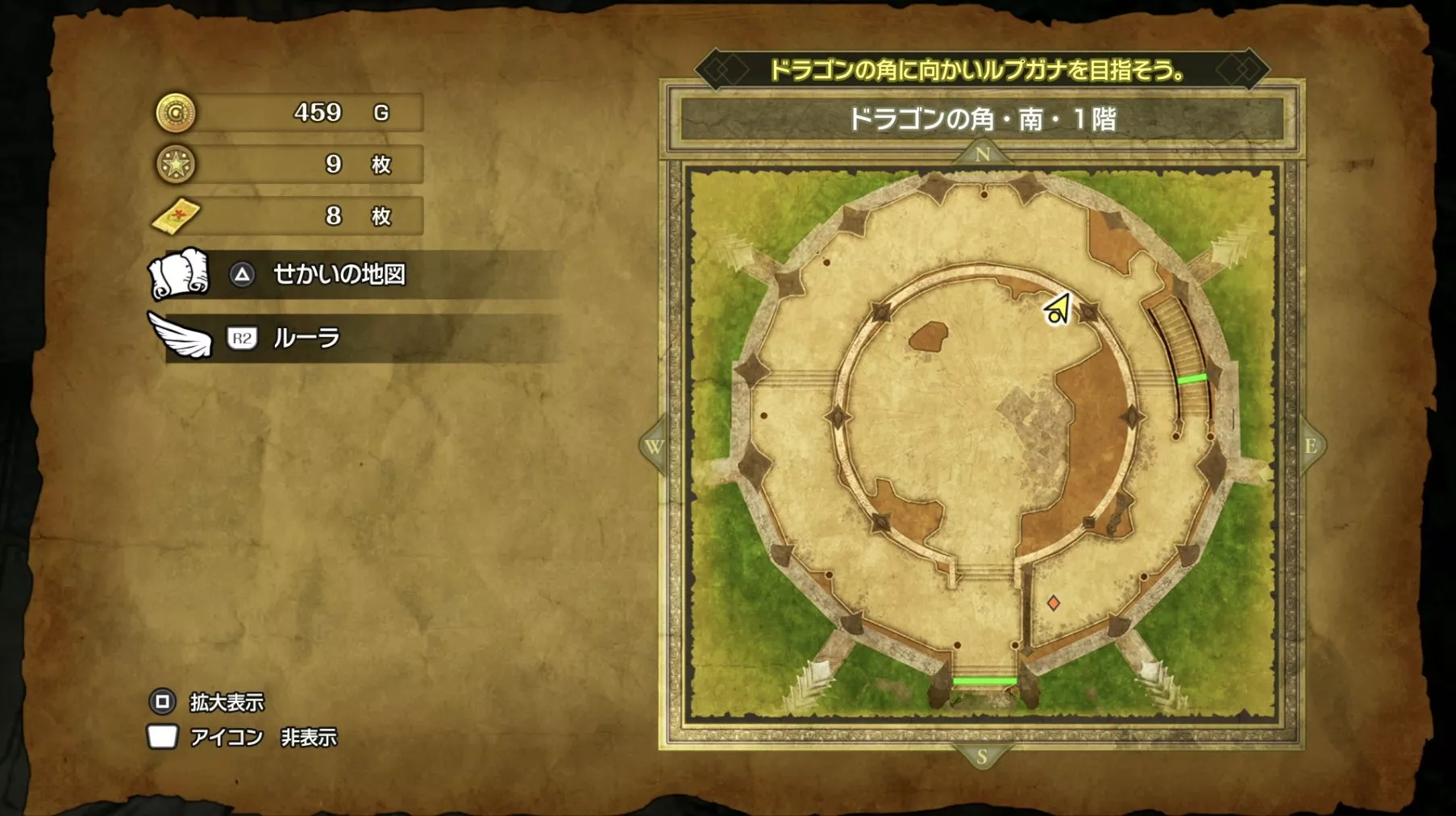 ドラゴンの角・北の最上階である6階の中央で「小さなメダル」を拾うことができます。キラキラなどの目印はなく、床に落ちているので上記の画像を参考にしながら探してみましょう。
