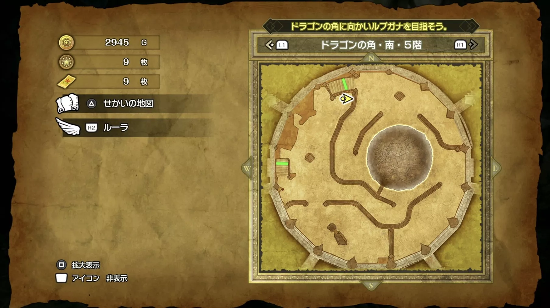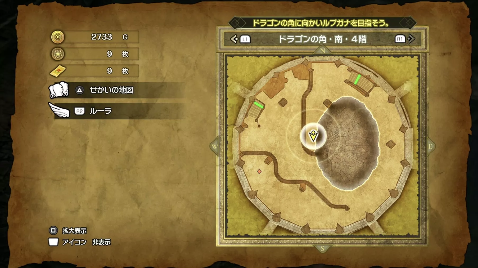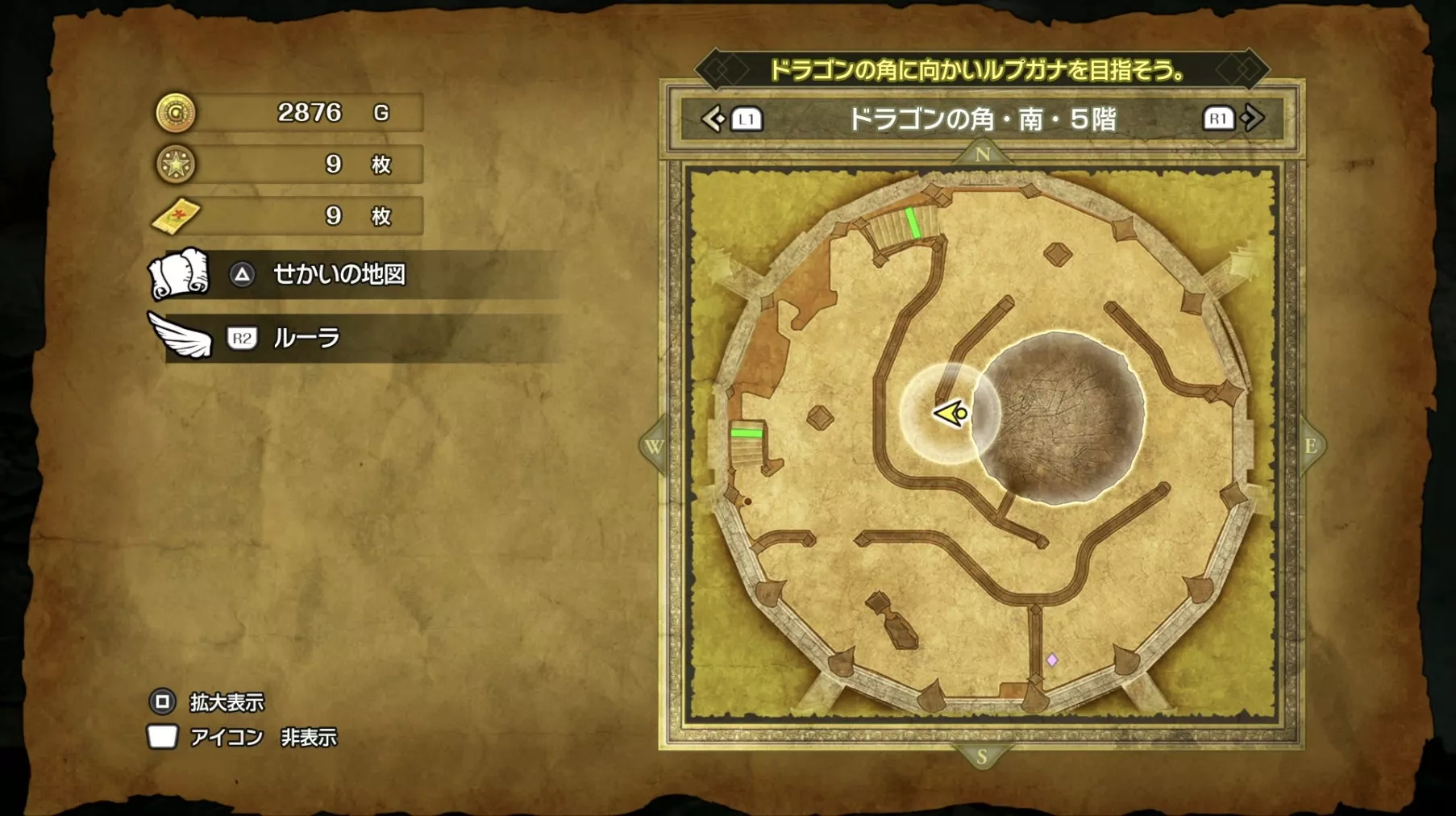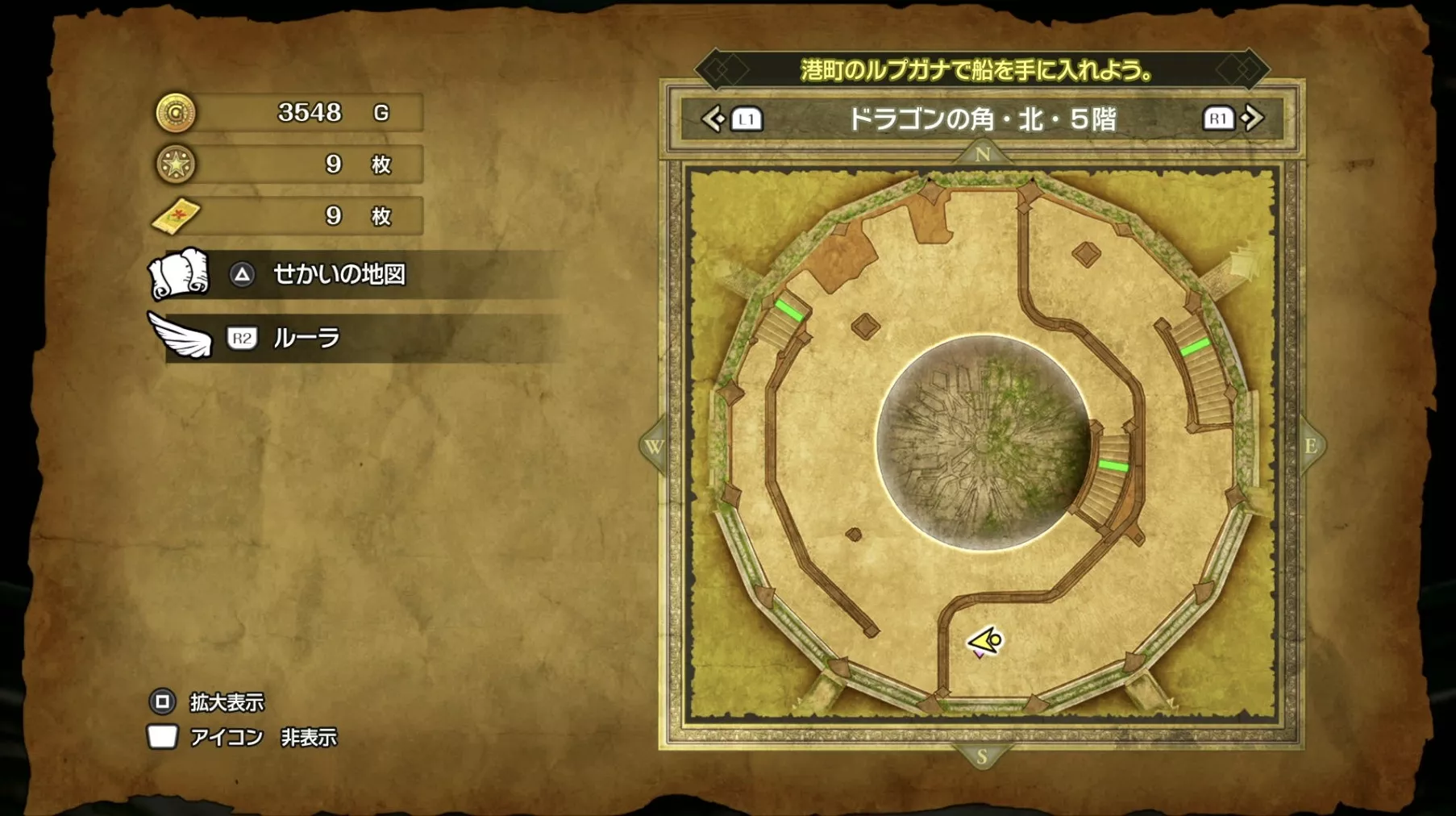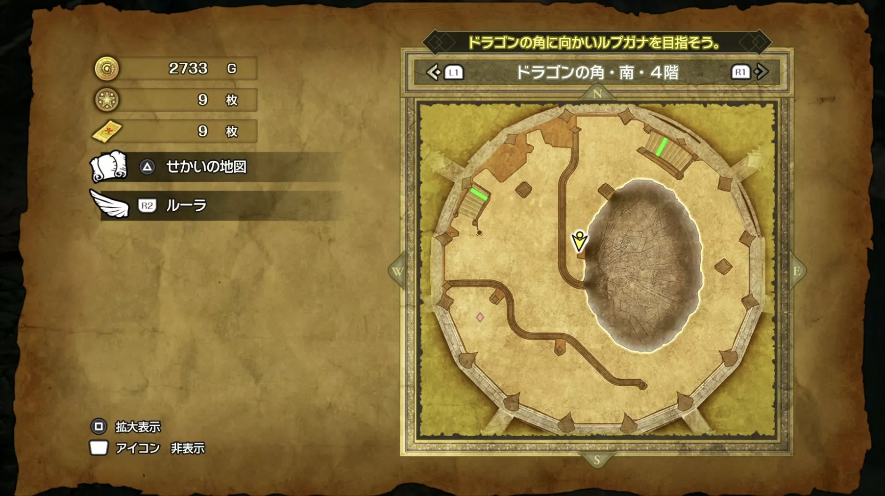 ドラゴンの角・北の最上階である6階の中央で「小さなメダル」を拾うことができます。キラキラなどの目印はなく、床に落ちているので上記の画像を参考にしながら探してみましょう。