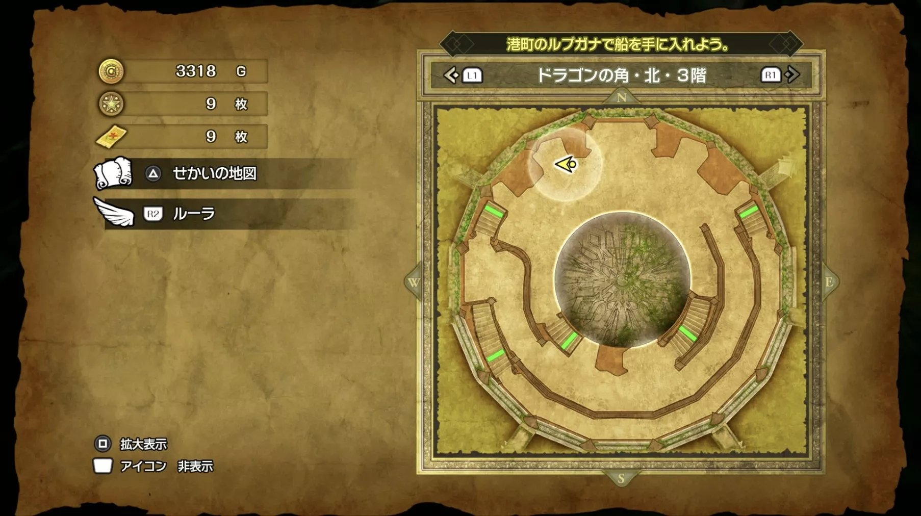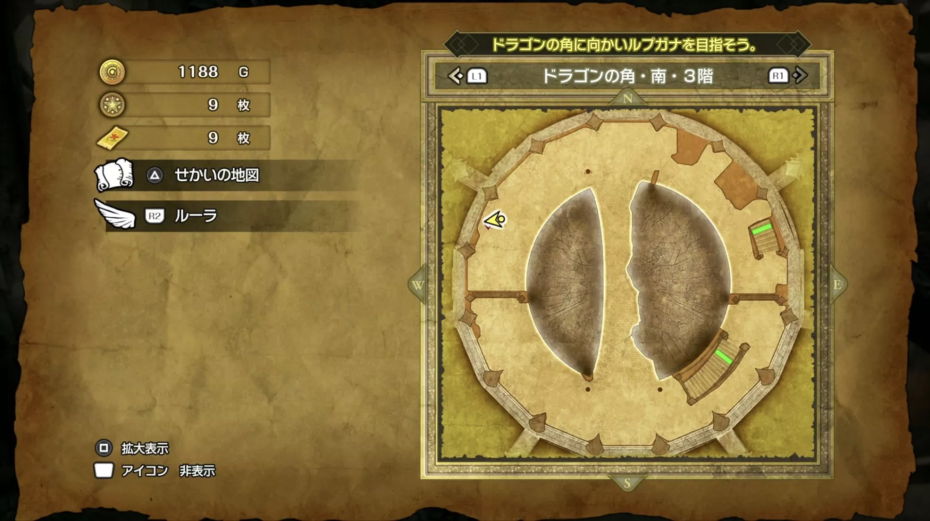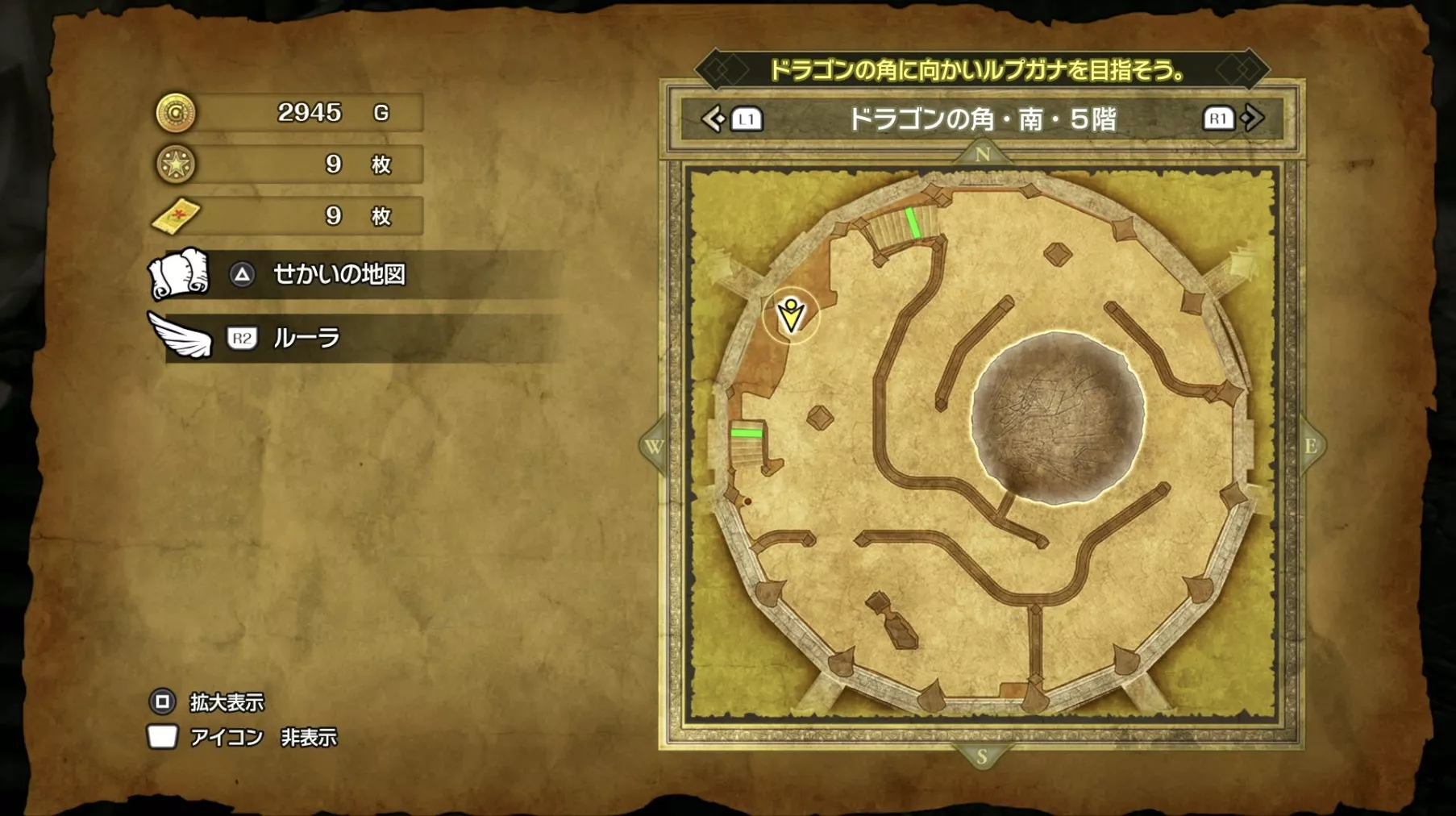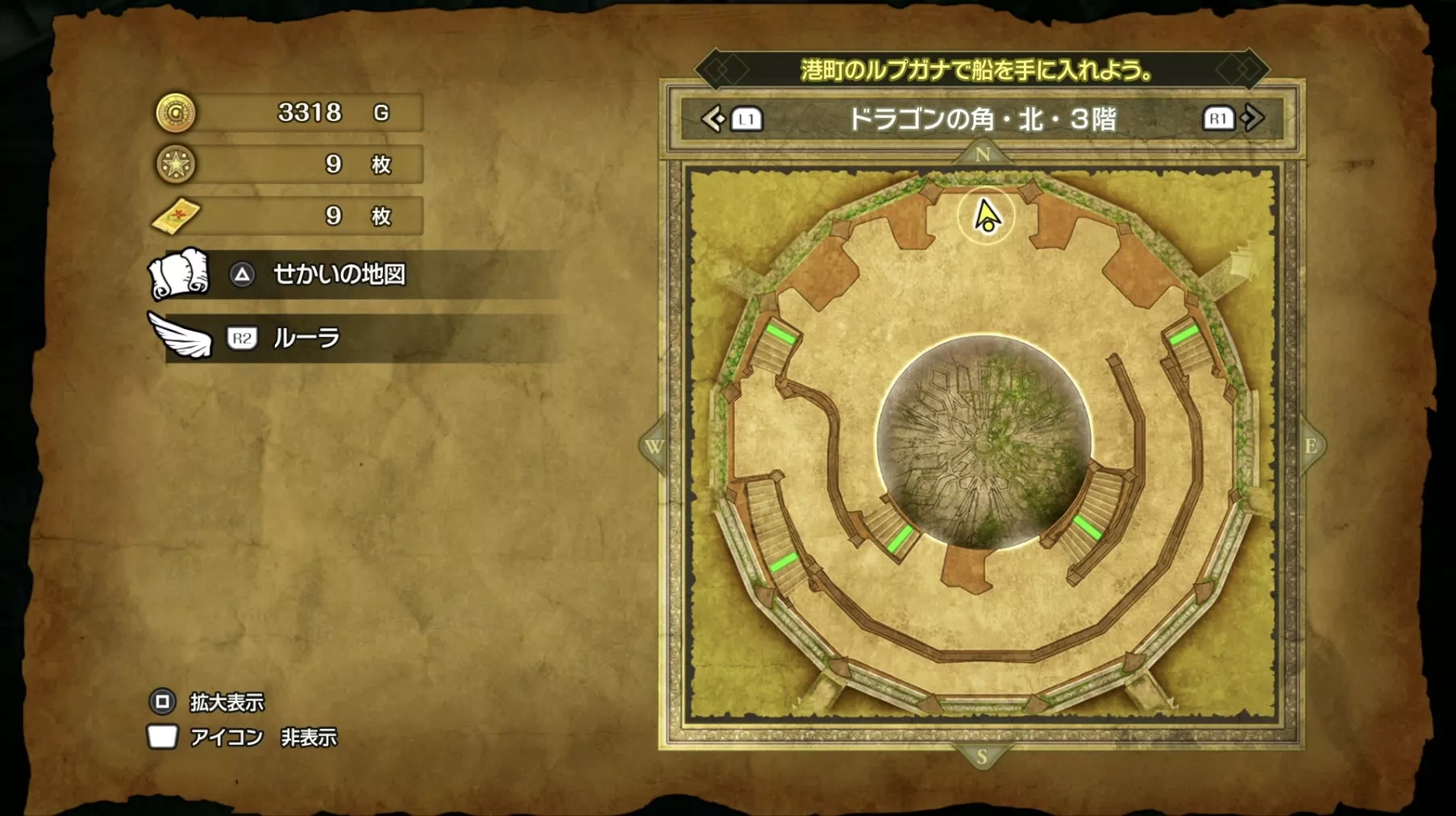 ドラゴンの角・北の最上階である6階の中央で「小さなメダル」を拾うことができます。キラキラなどの目印はなく、床に落ちているので上記の画像を参考にしながら探してみましょう。