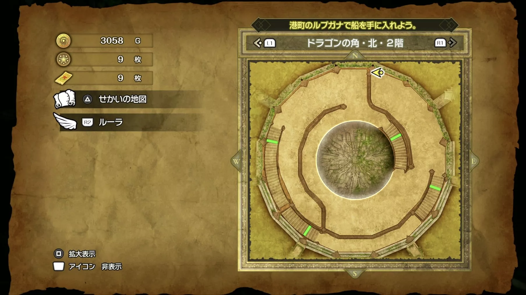 ドラゴンの角・北のマップです。ドラゴンの角・北では行動終了時にHPを回復できる「やすらぎのローブ」や全体回復の特技を習得できる「やすらぎの歌の巻物」を入手できます。また、3階では「みずのはごろも」の制作に必要となる「あまつゆの糸」を取得できるので、入手しておくのがおすすめです。