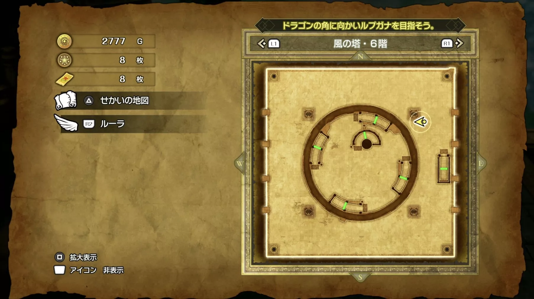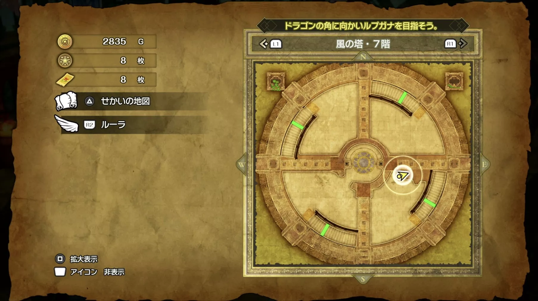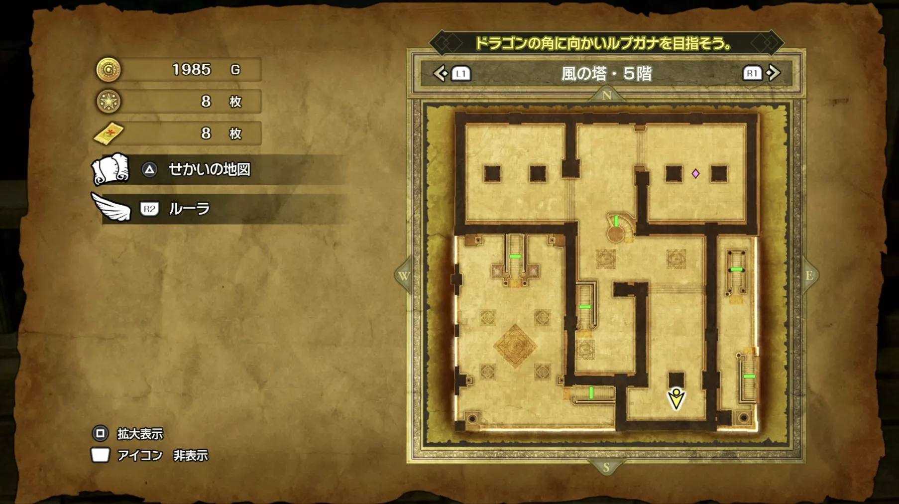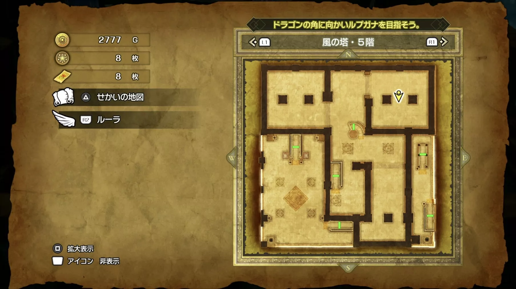 風の塔のマップです。ストーリーチャート3で訪れるマップとなっており、ストーリー進行に必要な「風のマント」は5階でボスを撃破した後に、ボスの後ろにある階段から2階に降りると入手できます。