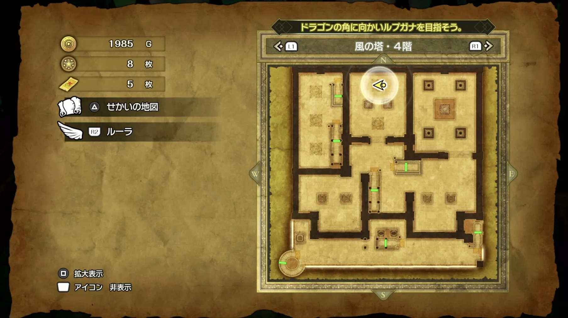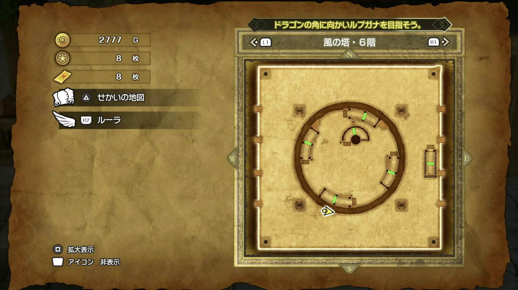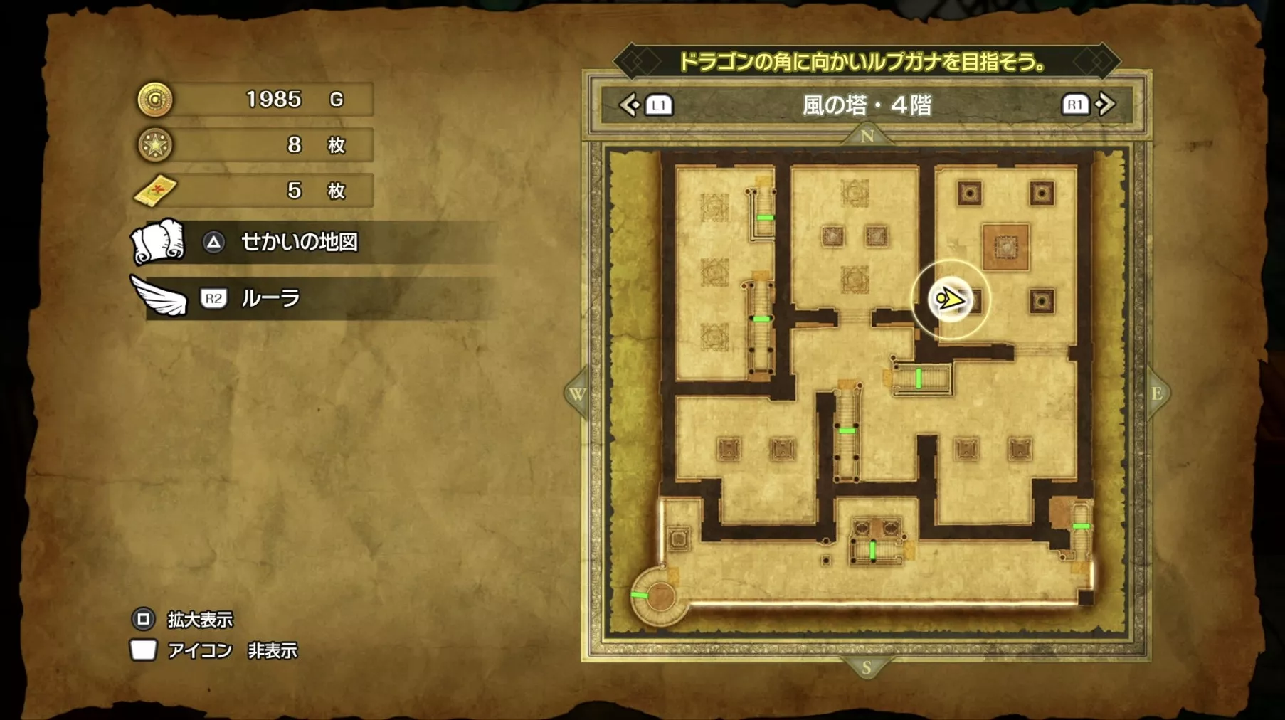 風の塔のマップです。ストーリーチャート3で訪れるマップとなっており、ストーリー進行に必要な「風のマント」は5階でボスを撃破した後に、ボスの後ろにある階段から2階に降りると入手できます。