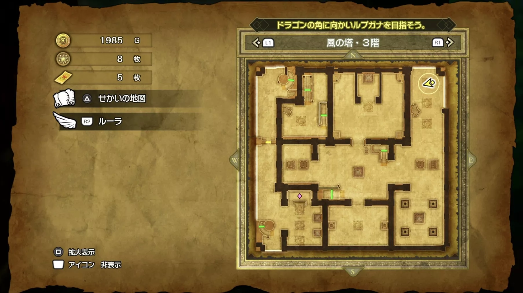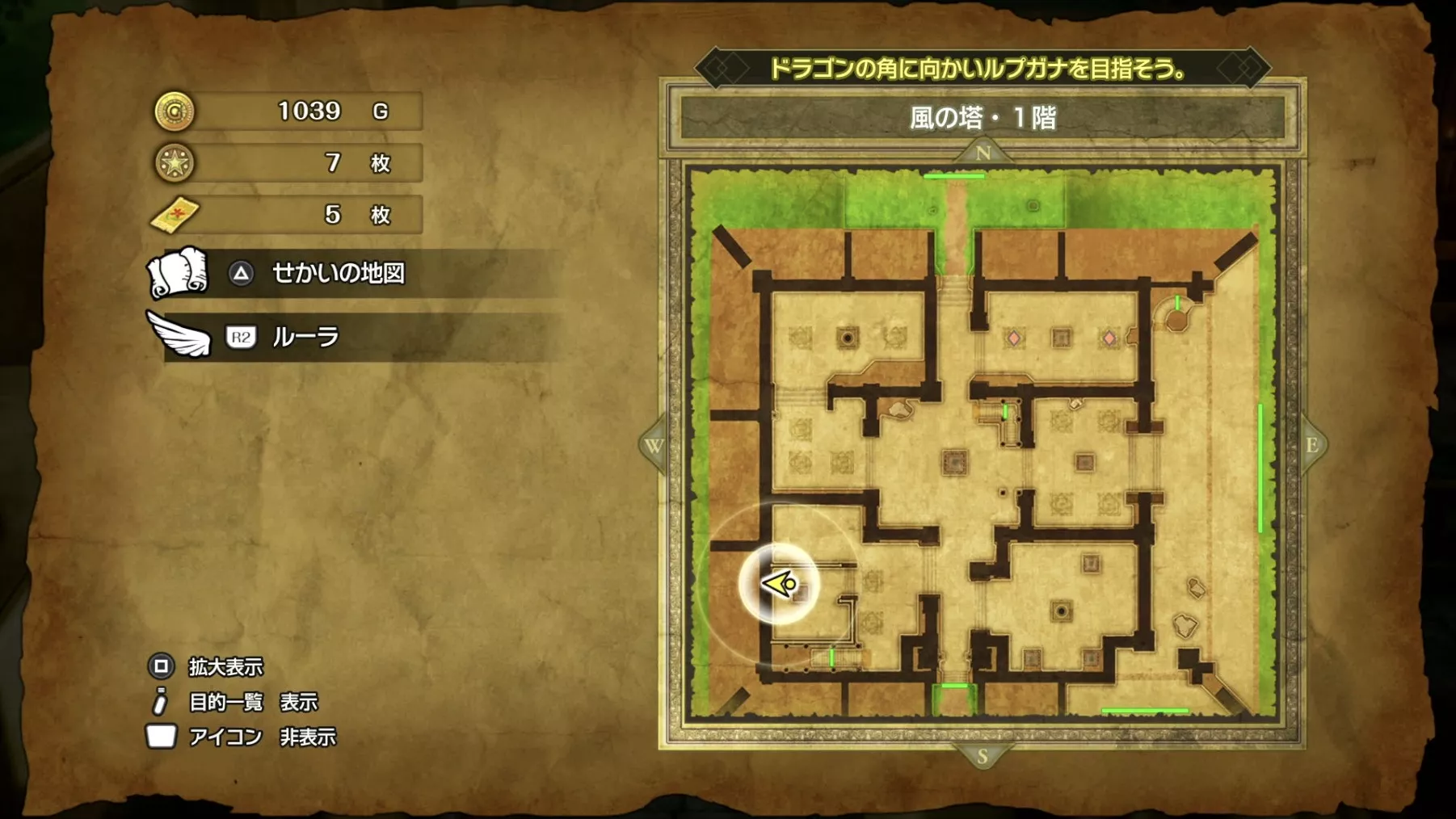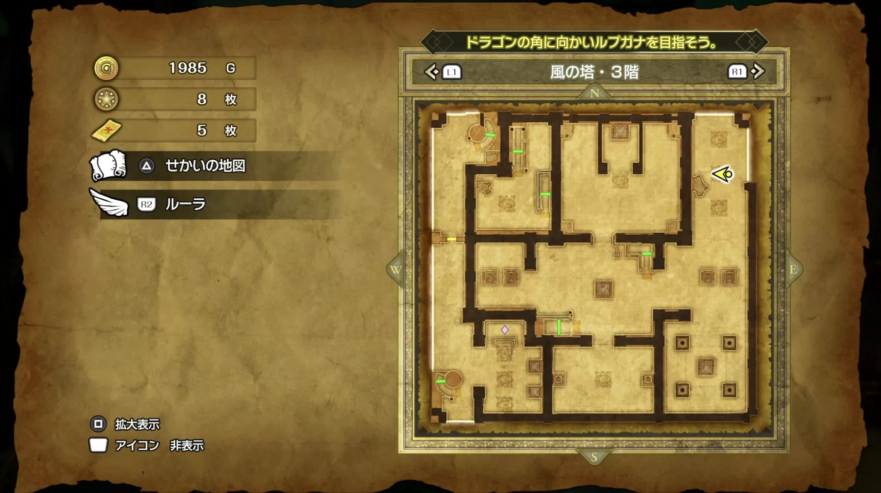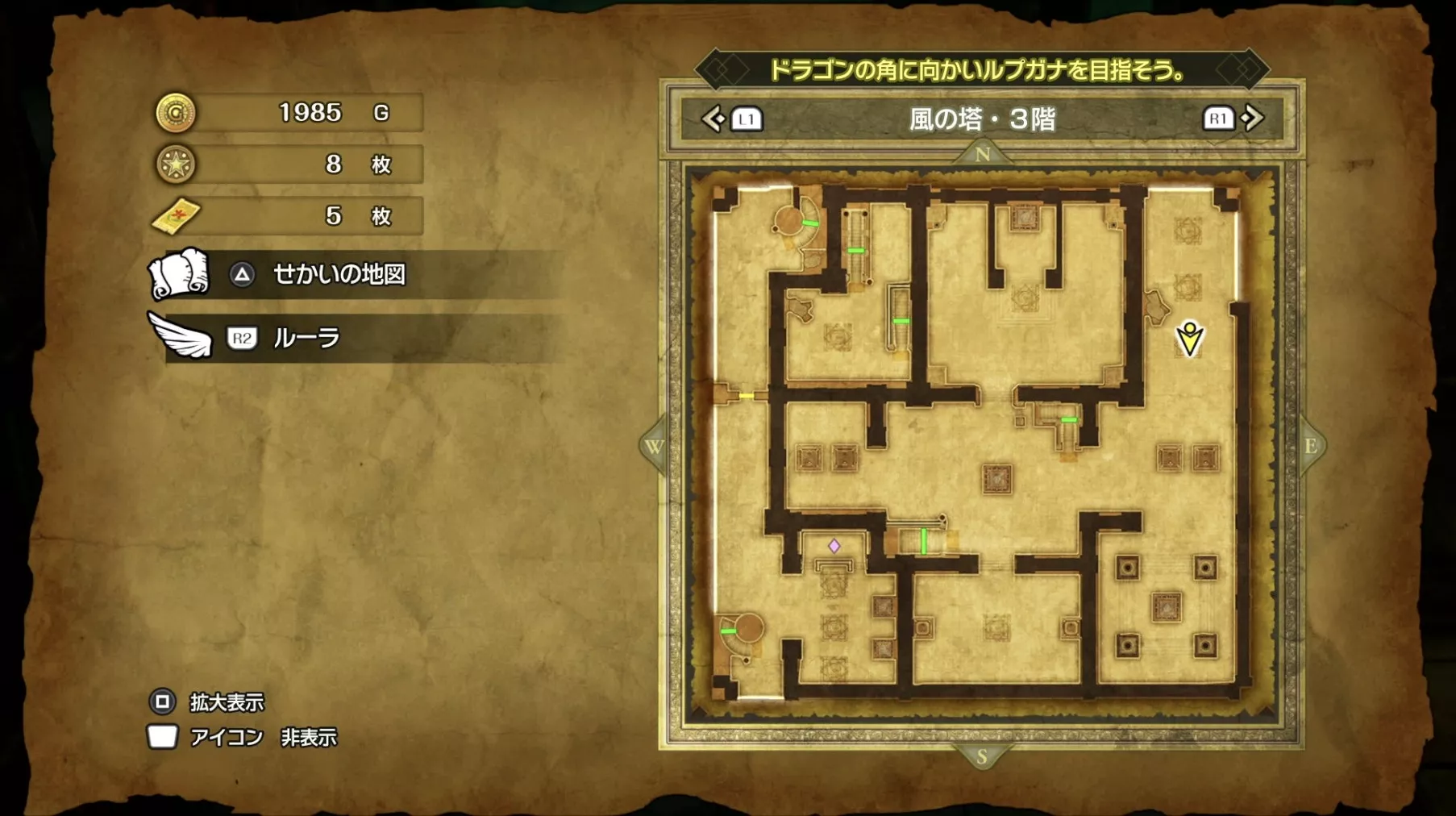 風の塔のマップです。ストーリーチャート3で訪れるマップとなっており、ストーリー進行に必要な「風のマント」は5階でボスを撃破した後に、ボスの後ろにある階段から2階に降りると入手できます。