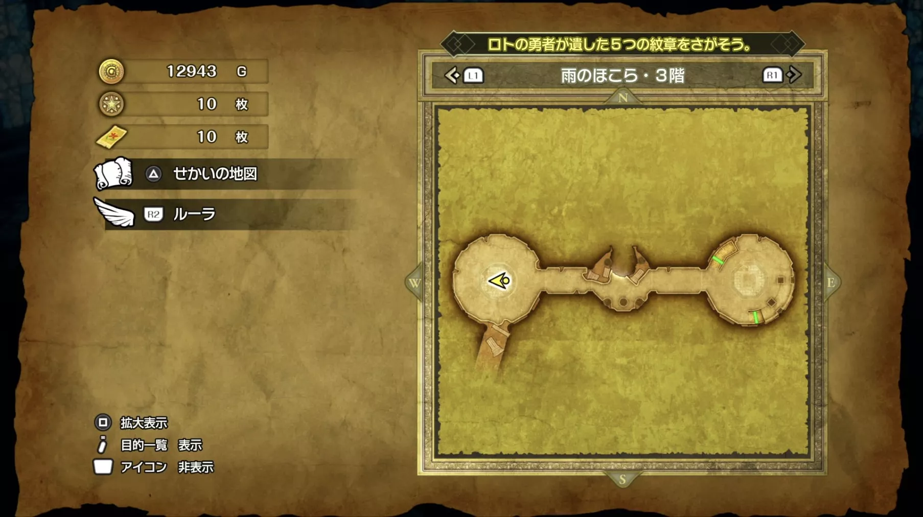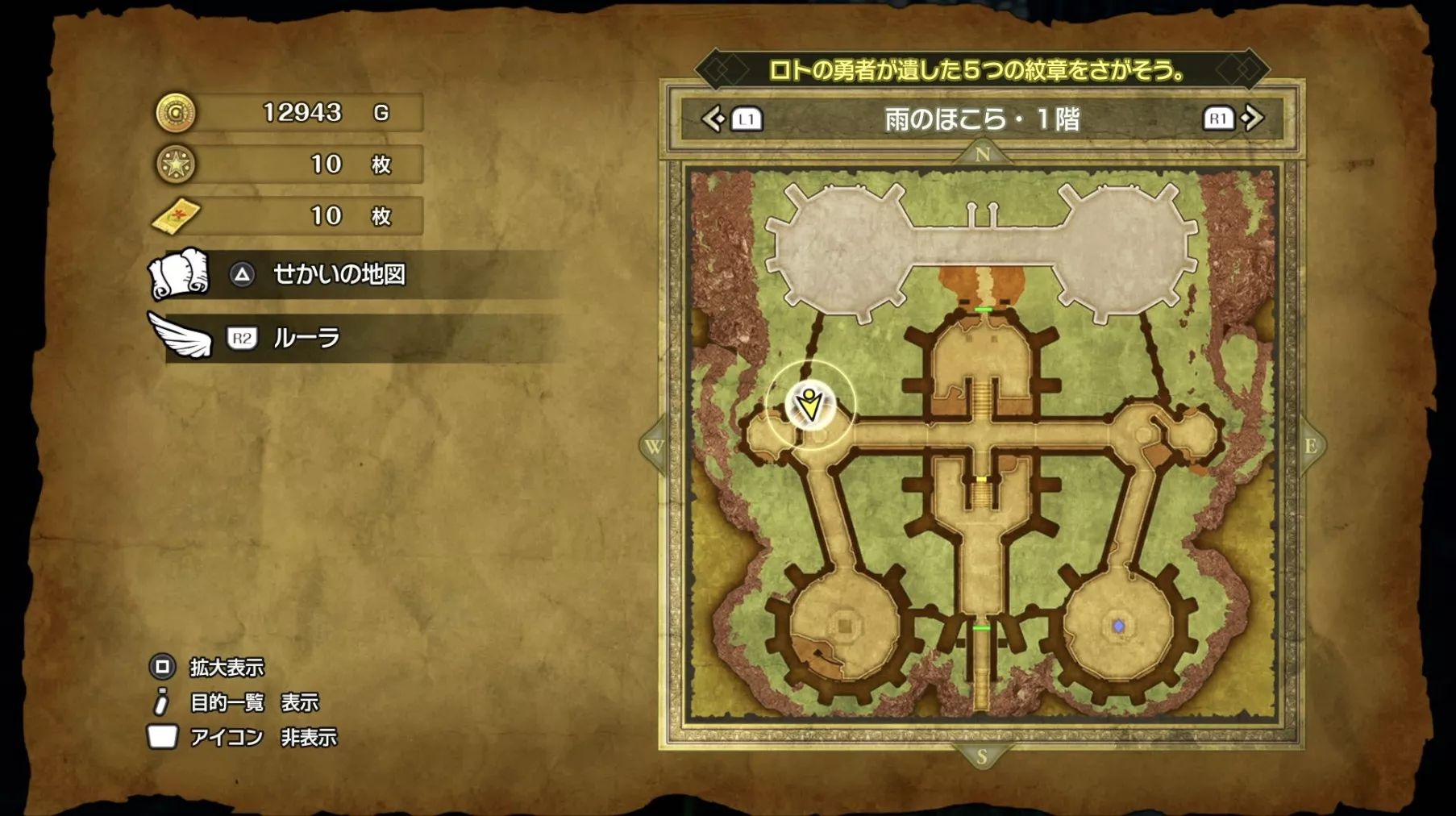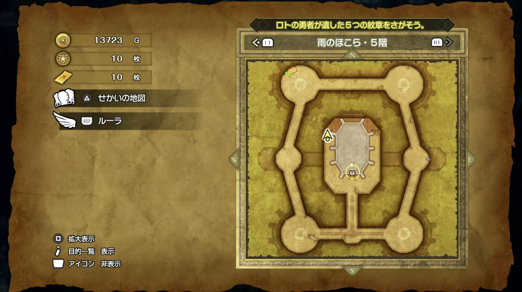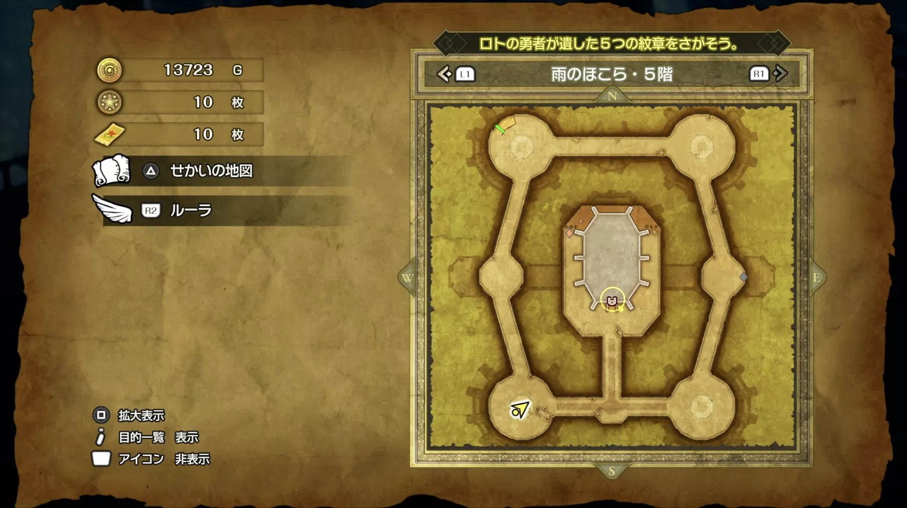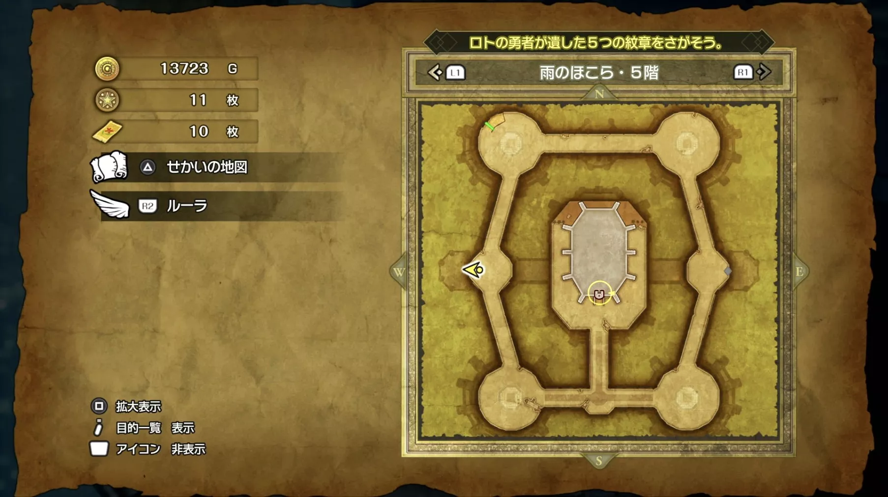 ボス戦後、イベントが発生し紋章を探す旅に出ることになります。イベントで入手できる「やまびこの笛」を使いながら紋章を集めましょう。雨のほこら・5階の部屋のルビスの像の裏では「まよけの聖印」を入手することができます。