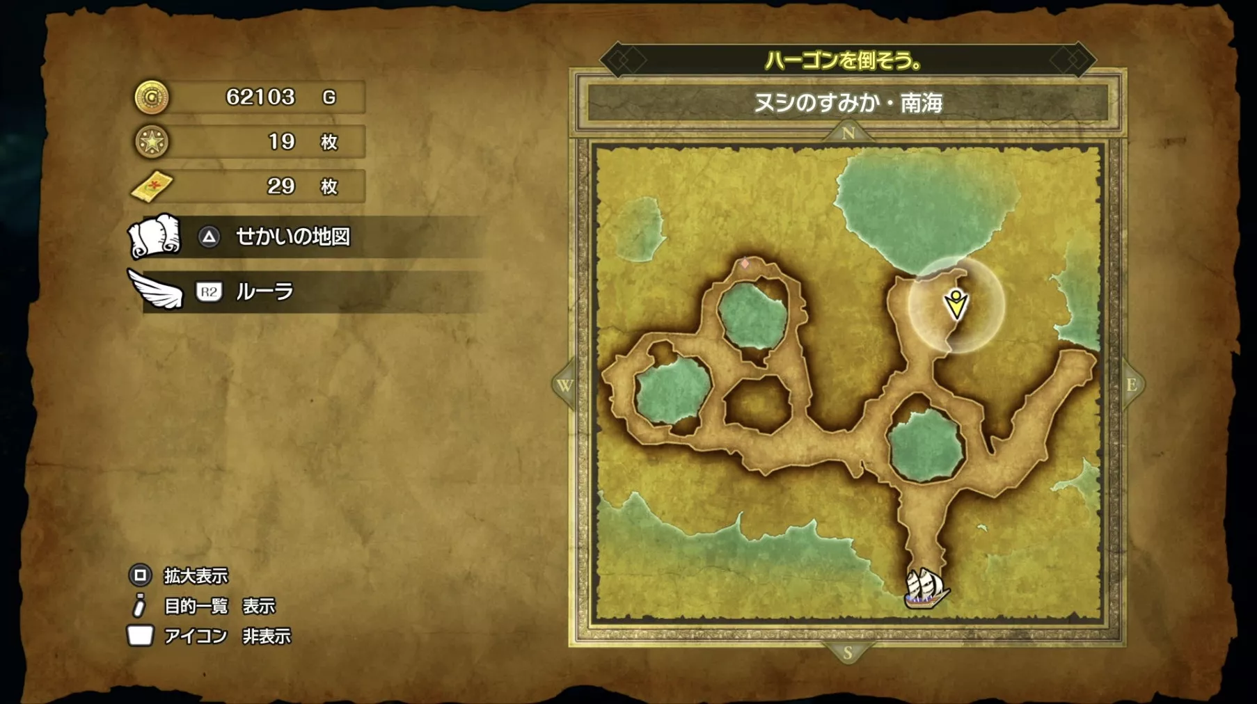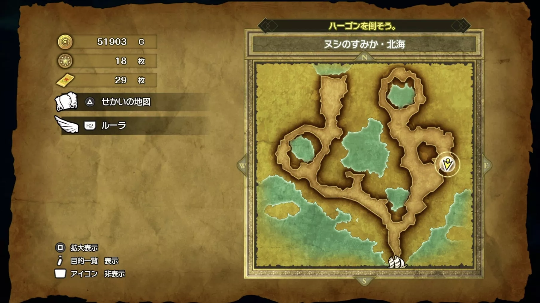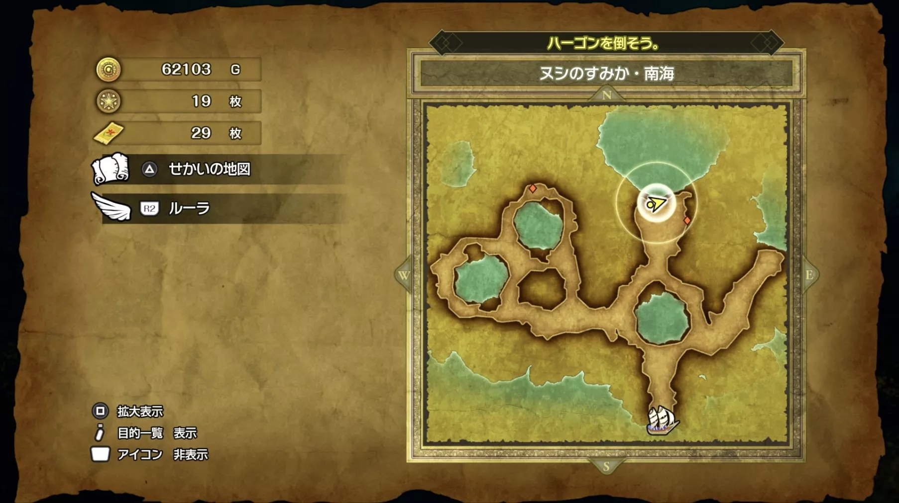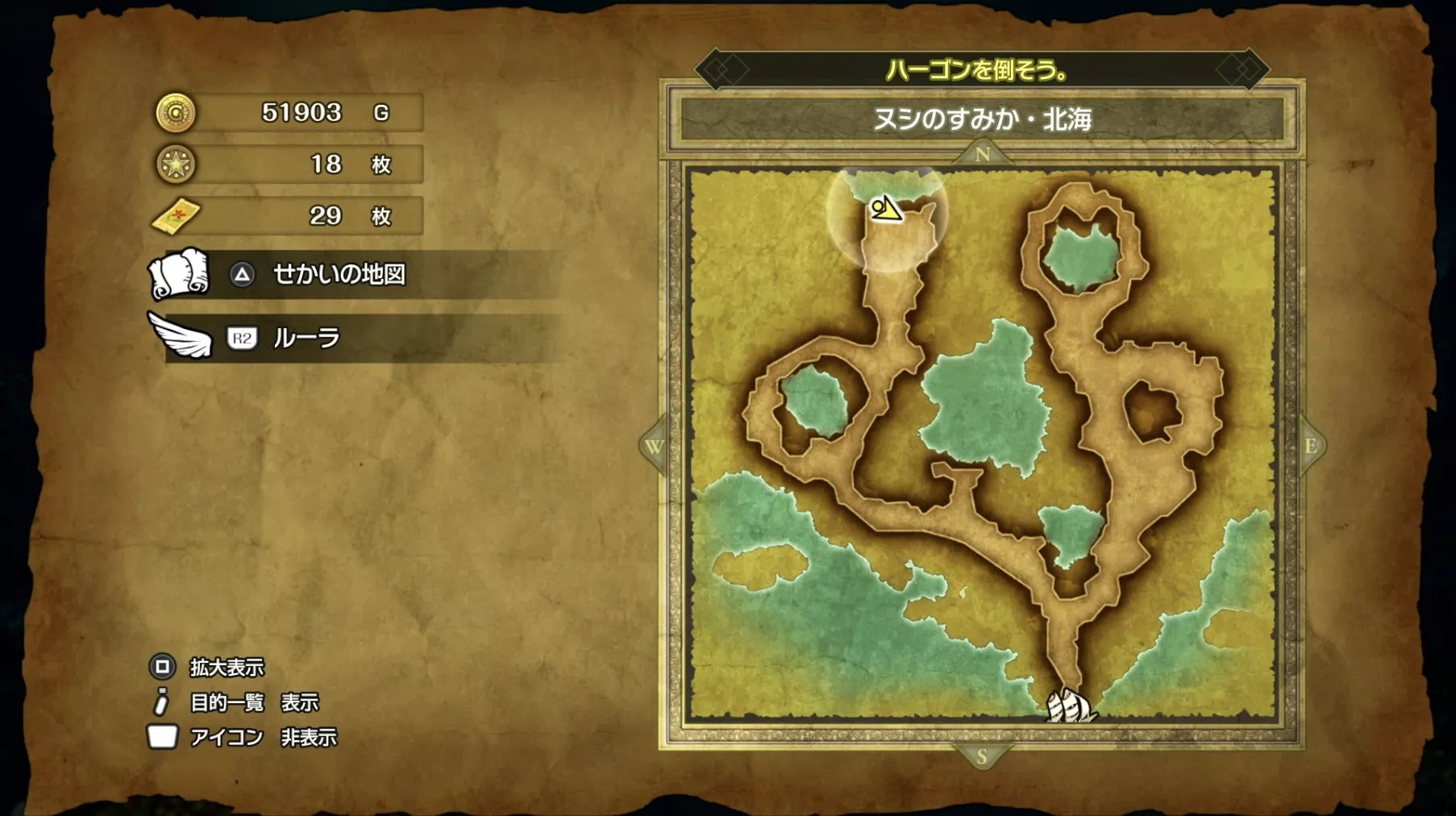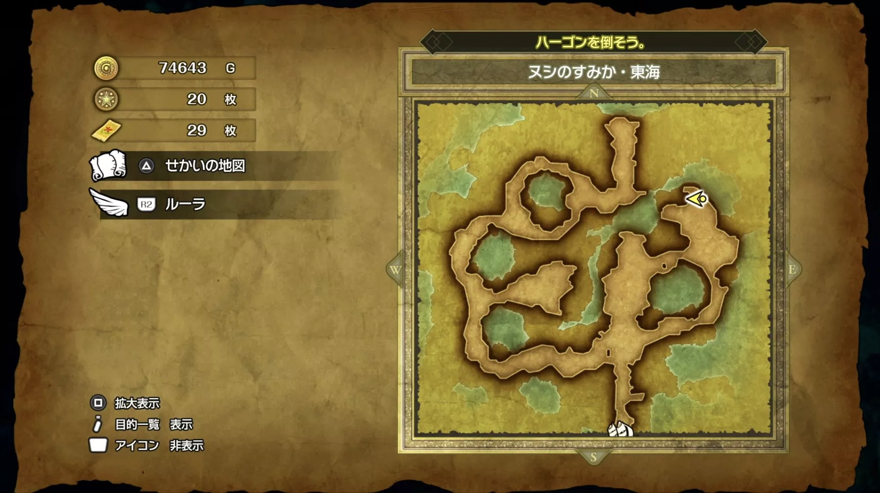 ヌシのすみか東海の場所はローレシア南のほこらの西です。ここにボスはおらず、世界の思い出等を貴重なアイテムもありません。
