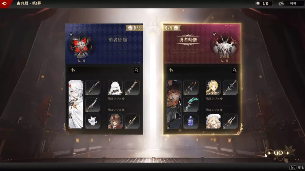 体験型劇場では、前半と後半で異なるパーティを使用します。各パーティごとに操作するキャラクター1人と近接武器・遠隔武器が1つずつ必須となり、戦友2人に武器を1つずつ装備できます。