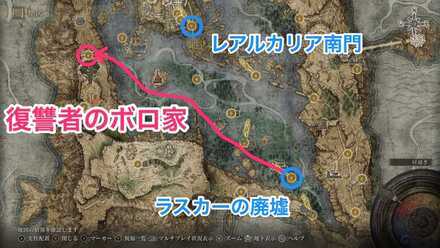 復讐者のボロ家は、リエーニエ西部の小黄金樹の北に位置しており、「ラスカーの廃墟」から北西に進むと辿り着けます。