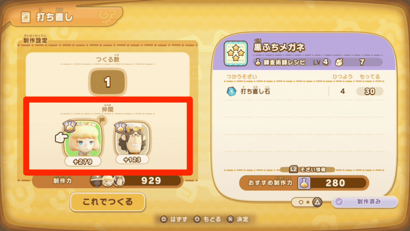制作時は、制作に参加する仲間が経験値アップスキルの装備を身に着けていないと効果が発揮されません。制作時には経験値アップがついた装備を製作に参加する仲間に装備しておきましょう。