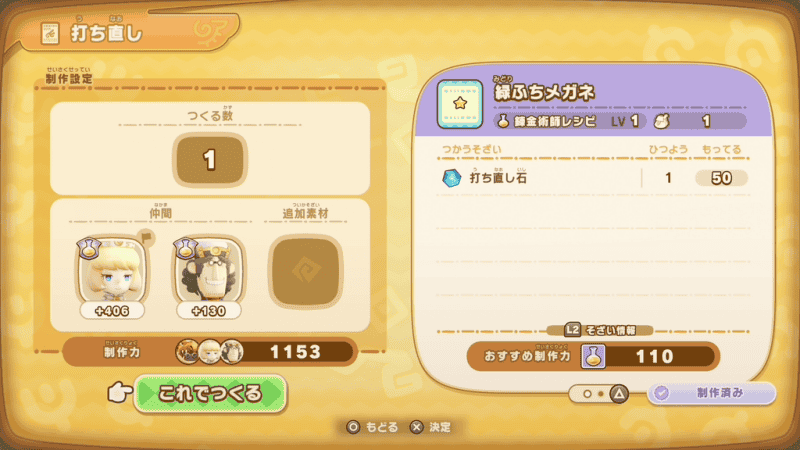 打ち直しの際に必要な打ち直し石の数はレシピのレベルによって変わります。レシピレベルが1の「錬金術師のメガネ」か「緑ふちメガネ」であれば打ち直し石の消費を1個に抑えられるかつ、制作時間も短いので、効率よく経験値アップ装備を量産できます。