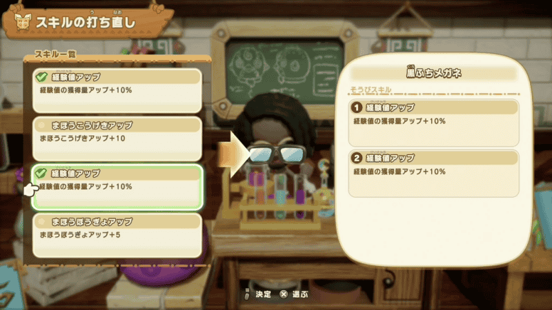 | 主人公 | 【メガネ】 ①経験値アップ+10% ②経験値アップ+10% 【チョウチョのチャーム】 ①経験値アップ+10% |