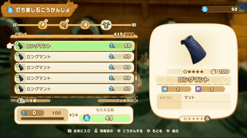 打ち直しで経験値アップを付ける際は、打ち直し石がたくさん必要になります。王家ミステニアの防具屋で購入できるロングマントであれば2個で打ち直し石1個と交換してくれるので、効率よく打ち直し石を集められます。