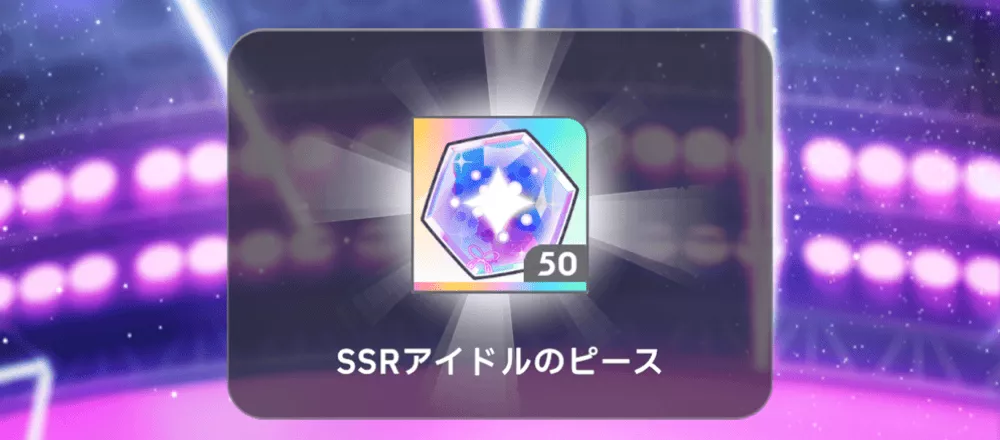 SSRピースは「アイドルへの道」のコンプリート報酬で入手可能です。12人のアイドルで25ステージ全て星3を取る必要があるので、プロデュースと並行しながら地道に進めましょう。