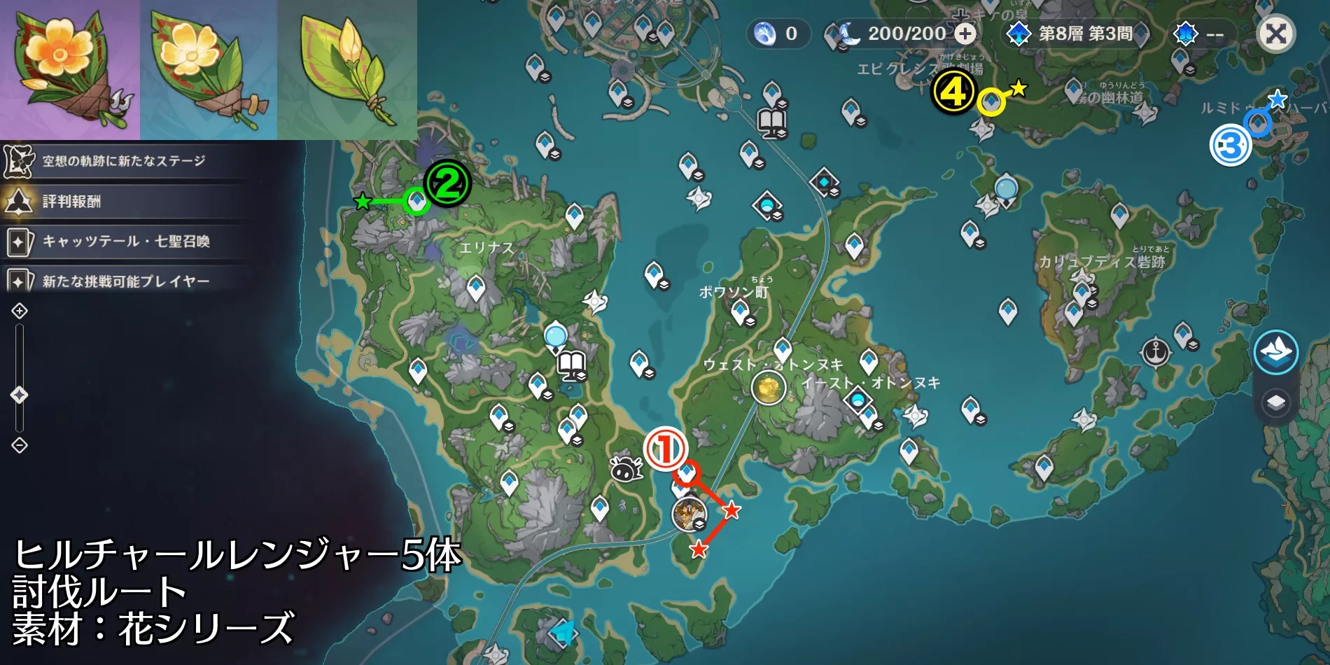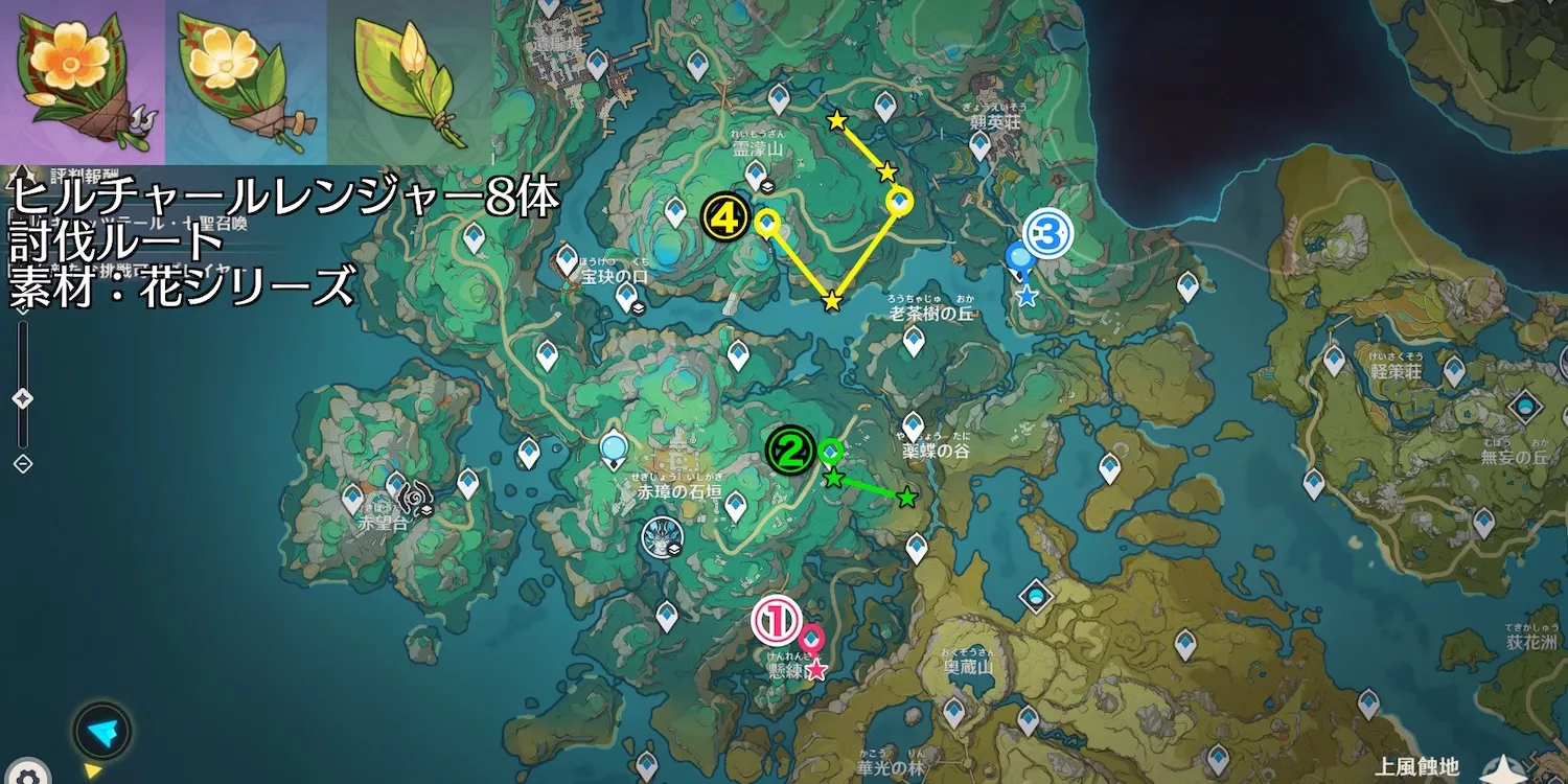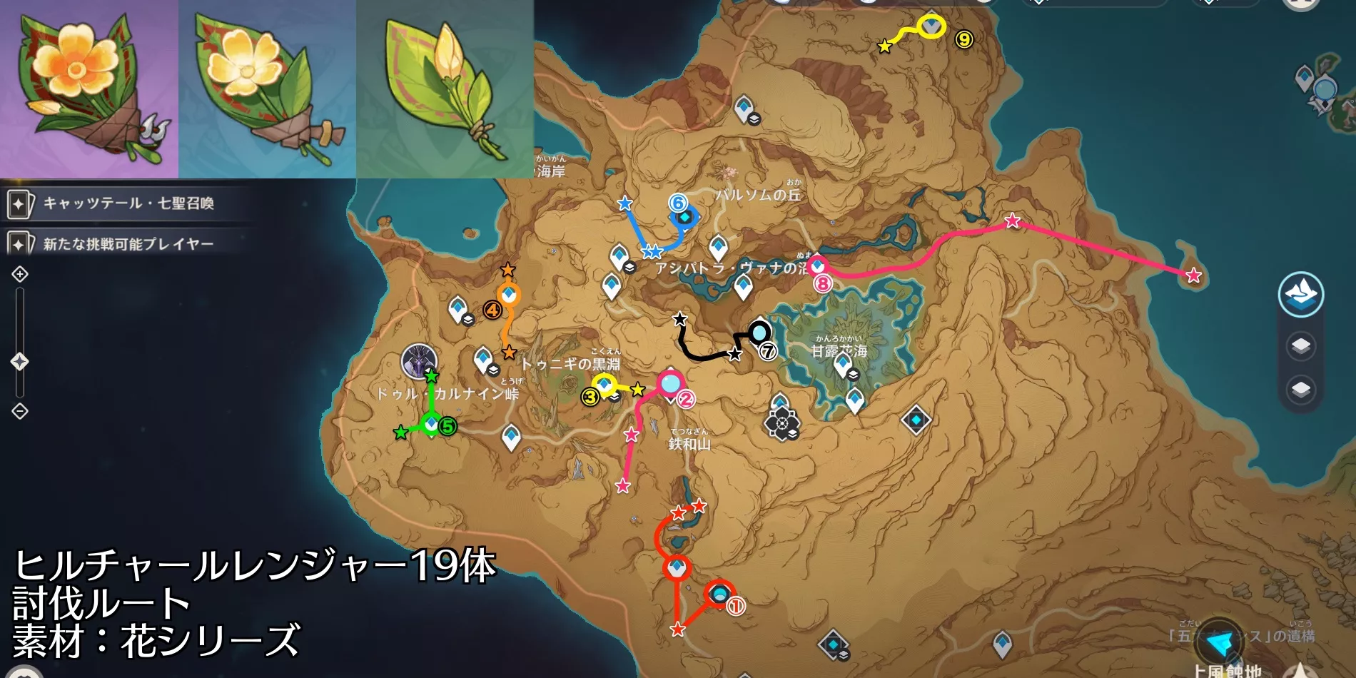 花(ヒルチャールレンジャー素材)集めの周回ルートと使い道・39体討伐ルート掲載