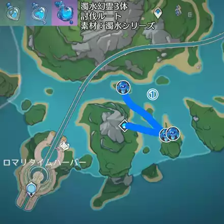 濁水幻霊素材収集ルート用マップはフォンテーヌのエリアに行くことさえできれば周回可能になります。フォンテーヌは他のエリアから海を隔てて存在するため、海を越えることでストーリーを進めずとも行くことはできますが、序章だけでも魔神任務をクリアしていれば近くのワープポイントが解放されるため、いくらか行きやすくなりおすすめです。