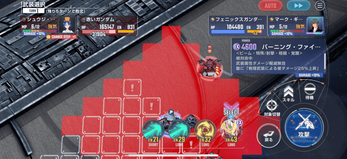 赤いガンダムはチャンスステップ2回持ちのキャラを2体使うことで、1ターンで周回をすることができます。GQuuuuuuXをSP化させていない場合や武装レベルが低いままだと、自軍ターンで倒しきるのは難しいため、サポートをより強力なものにするか、攻撃力が上がるオプションパーツを装備しましょう。