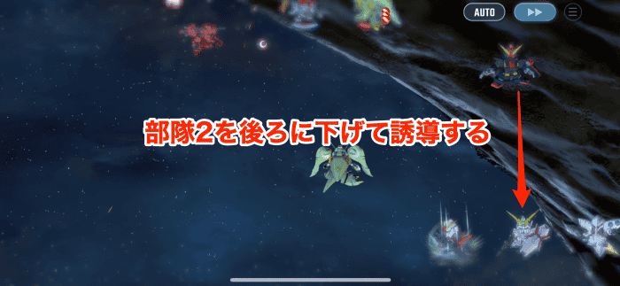 サイコガンダムは支援防御3回行うので、第1部隊がHPの低いクィンマンサに対してダメージが出しにくくなります。部隊2でサイコガンダムが支援防御できない範囲まで誘導することで部隊1がクィンマンサに対してダメージを与えやすくなります。