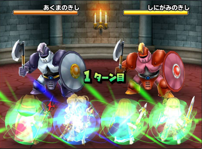 3戦目のあくまのきし&しにがみのきしはしにがみのきしがベギラゴンをやってくる前には突破しましょう。左のあくまのきしは、右のしにがみのきしをずっとかばい続けますが、その間は攻撃してきません。右のしにがみのきしはベギラゴンをスキル攻撃でやってくるので、ベギラゴンを受ける前にコンボを繋げてスキルで攻撃しましょう。