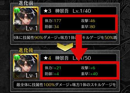 レアリティが上昇するに伴ってレベルが1に戻ってしまう代わりに、初期ステータスに強化が施されるのも特徴の一つです。そこにレベル上限の解放も相まって、最終的なステータスの向上へと繋がります。