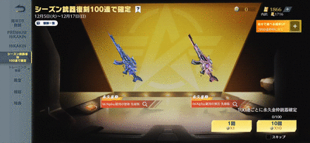 荒野行動(Knives Out)における、シーズン銃器復刻100連で確定ガチャのガチャシミュレータです。運試しや験担ぎ、暇つぶしなどにお使いください。