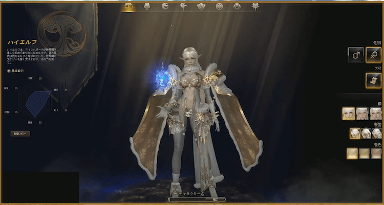 ▲実際のゲーム画面でのハイエルフ(女性)。髪型や顔の種類は3種類と他種族と比べると少なめだがどれも気合の入った造形だ。
