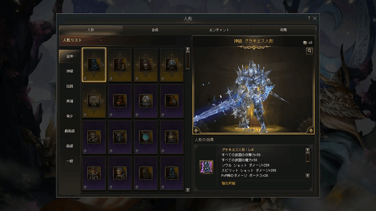 ▲神級ペリオン人形は入手できれば相当な戦力になってくれそうな予感。またペリオン人形は同じものを入手した場合はエンチャントでさらに強化できる模様。