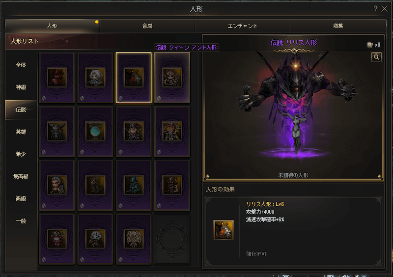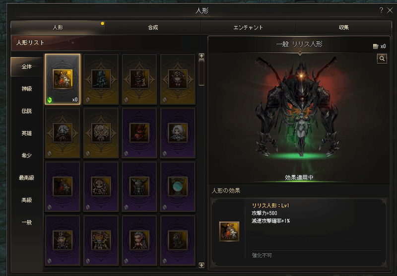 ▲上記の一般リリス人形と比べても明らかに攻撃力の数値が高いことがわかる。こつこつ集めて確実な成長を目指そう。