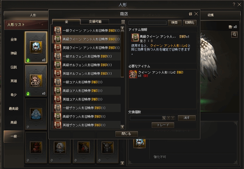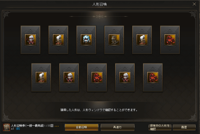 なお、クラシックとは実装されている人形の種類が異なり、アデンサービスでは神級の人形がやや多くなっています。
