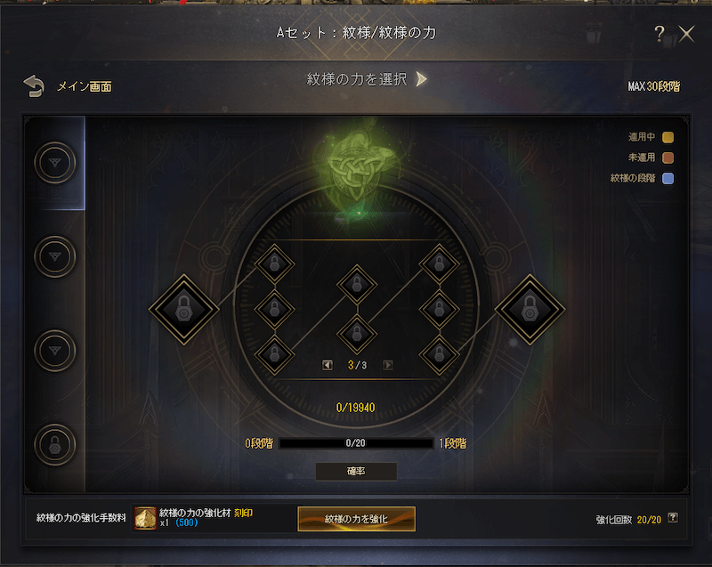 紋様の力のレベルが20から30に拡張されます。強化には「最高級染料強化剤」が必要となり、こちらは特殊製作から入手が可能です。