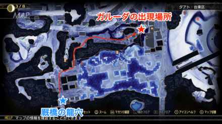 ガルーダは、ウエノの龍穴南にあるモトアサクサの高台二出現します。モトアサクサの高台へ行くには厩橋から北へ進んで細い道を経由して向かう必要があるので、厩橋の龍穴から向かいましょう。また、高台に到着後はしばらく放置するとガルーダがこちらによってきます。