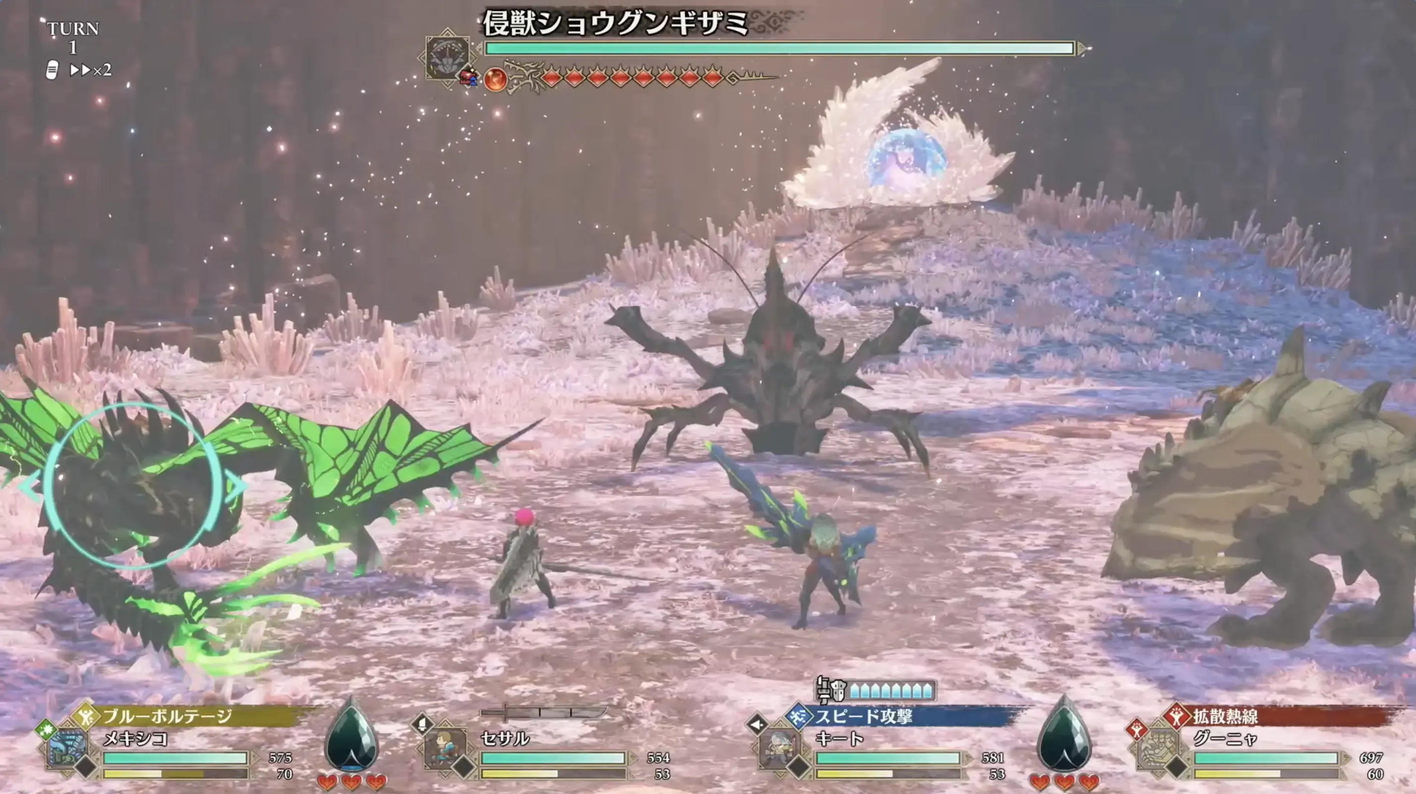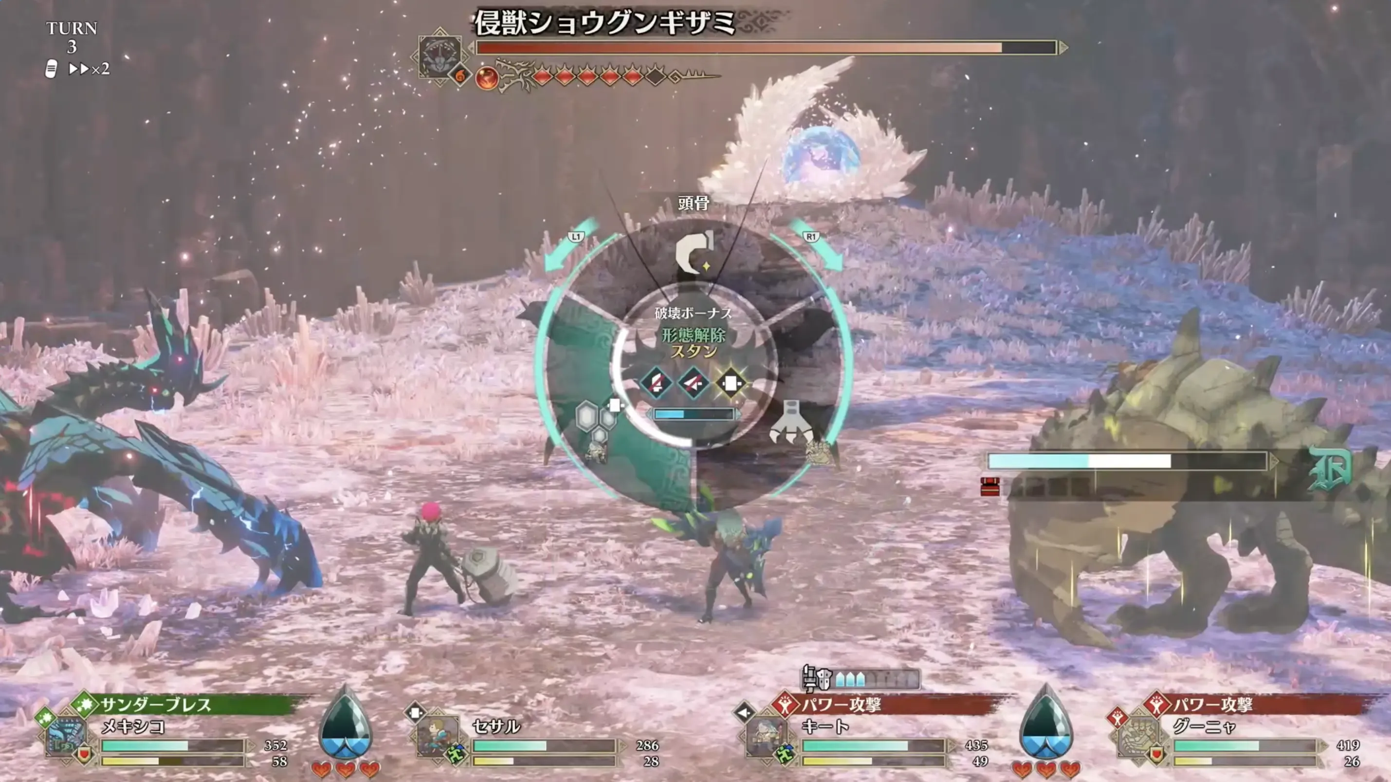 2ターン目、主人公は飛躍のメロディを使いましょう。さきほどオトモに使った硬化薬の効果がアップします。オトモンは前のターンと同じ考え方で行動しましょう。| モンスター | 3すくみ | 弱点属性 |
