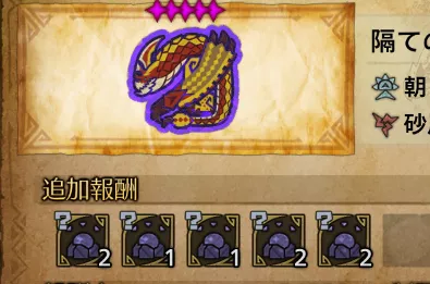 | 1枠の報酬数 | 【光るお守りが1つのみのモンスター】 ウズトゥナ・レダウ・アルシュベルド・ヌエグドラ・タマミツネ 【光るお守りが2つの枠があるモンスター】 セルレギオス・ジンダハド・ゴアマガラ・ラギアクルス |