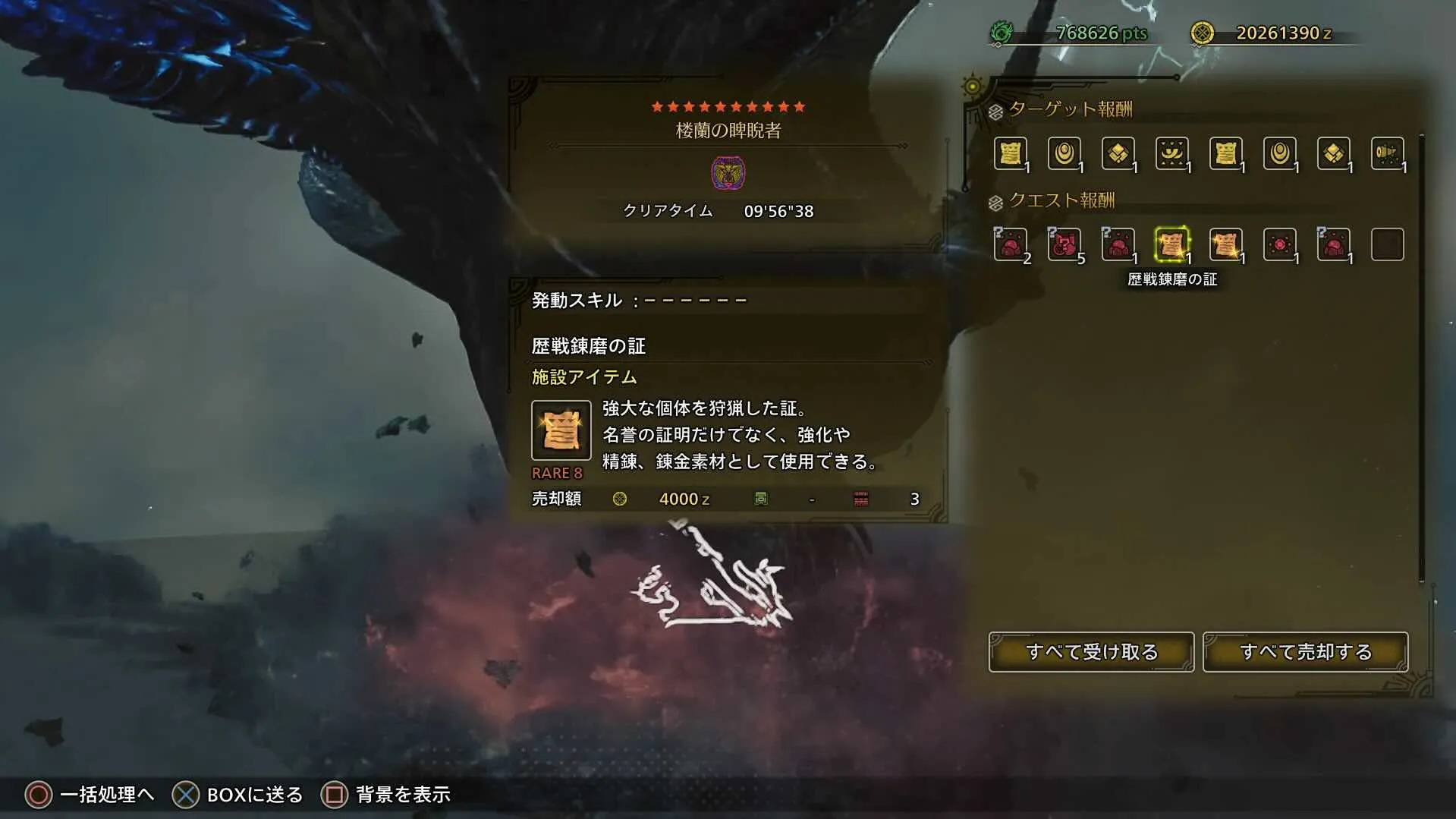 また、歴戦王ジンダハドと歴戦王アルシュベルドは狩りづらいモンスターではあるものの、1枠の報酬が多いため、1クエストごとの報酬が非常に美味しいです。