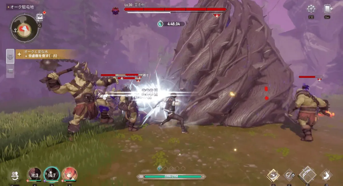 駐屯地に入り、ストーリーが終わると「空虚樹」との戦闘になります。制限時間は5分です。戦闘が開始したらまずは周りにいる大量のオークを倒して被ダメージを抑えましょう。空虚樹がクラッシュゲージを出したら全力で攻撃することで強力な攻撃を阻止できます。|