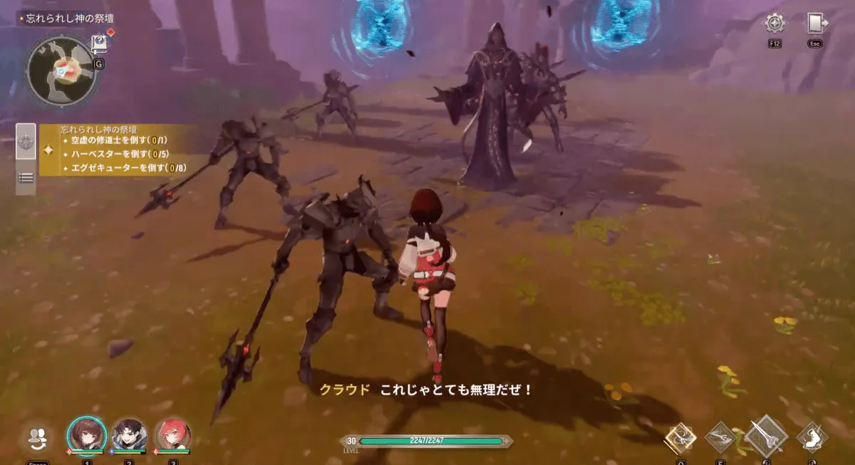 ニタを助けようとすると黒の軍団の正体であるハーベスター、エグゼキューター、空虚の修道士が襲いかかってきます。第2回戦ではレイナ、フレア、エステルを体験で使用でき、敵は風属性が弱点なのでエステルのスキルで一掃しましょう。