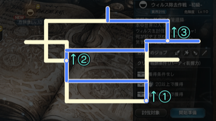 ニーアコラボ限定討伐依頼「ウィルス除去作戦」は、上方向にしか進めない道をあみだくじのように選んでいくステージです。