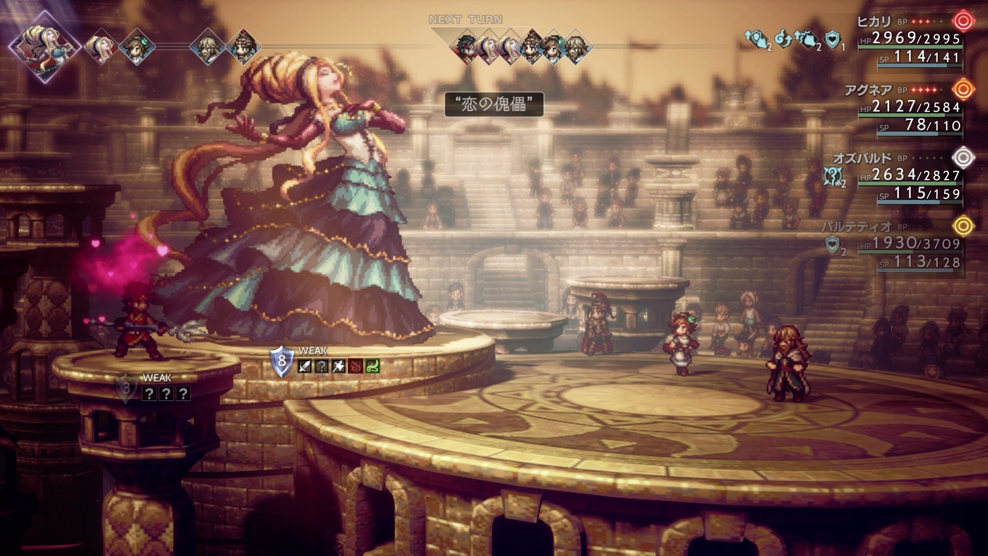 スタードルシネアは「恋の傀儡」で味方1人を魅了して敵になります。魅了された味方はシールドが3でHPも6000と少ないので、ブーストを使って最優先で倒しましょう。魅了された味方を倒すとパーティーに再び戻ってきます。