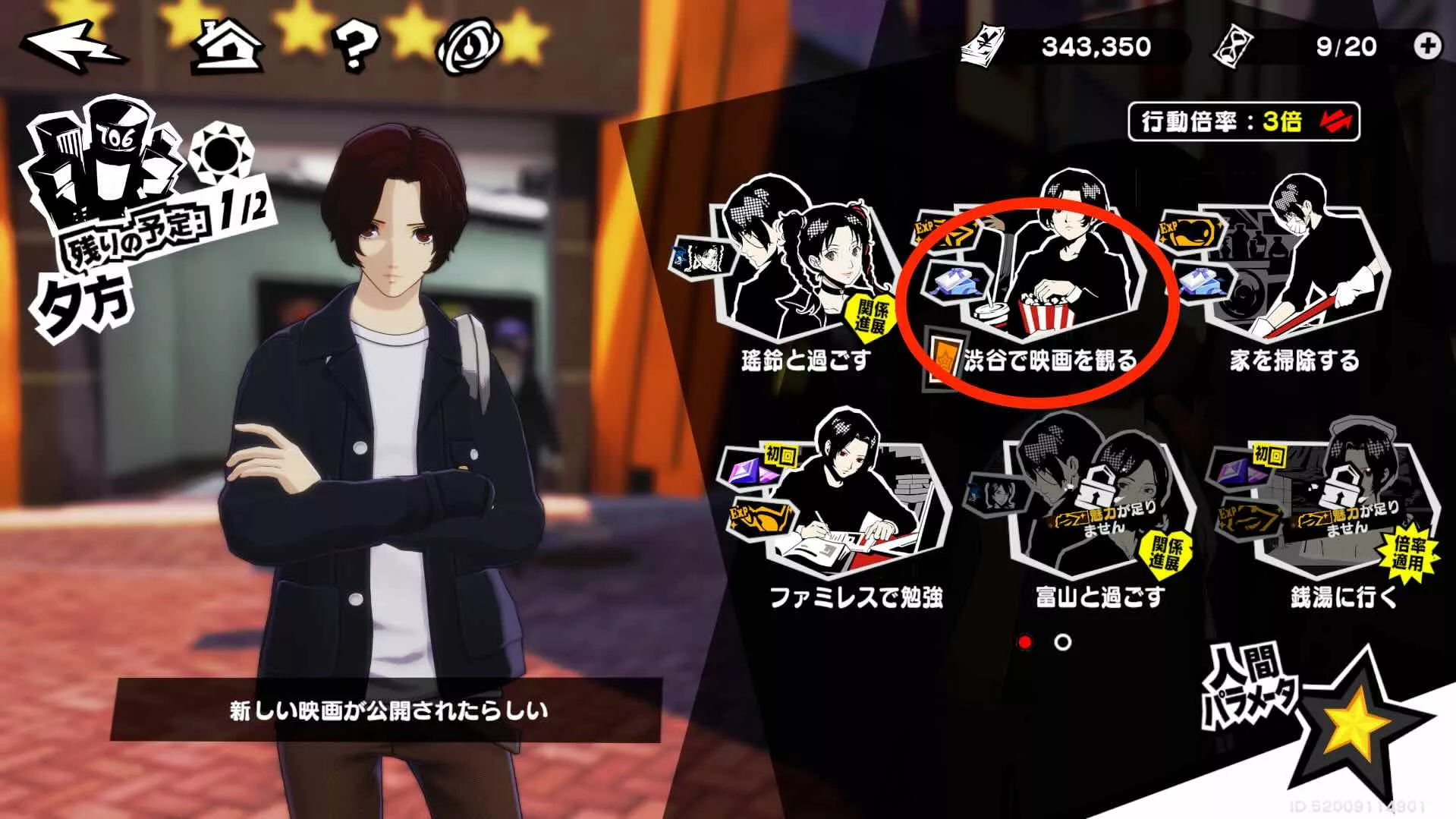 自分が上げたいパラメータの映画を選びましょう。1200円と行動力1消費することで映画を見ることができます。 |