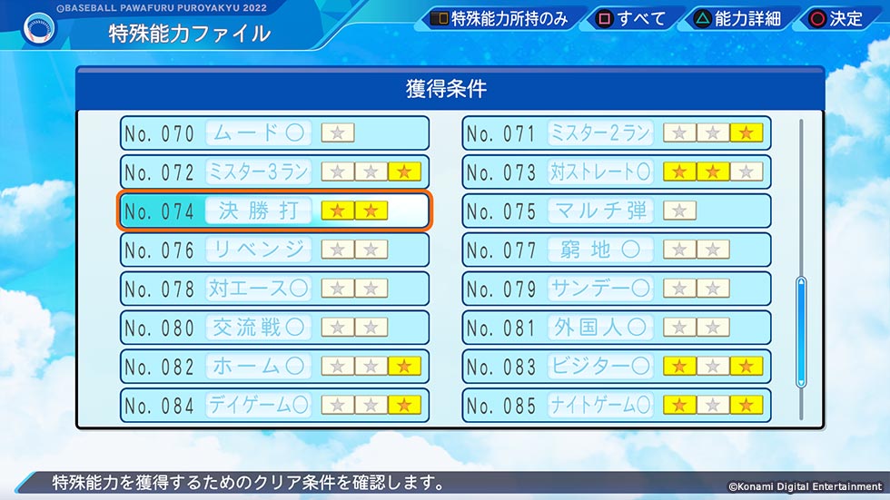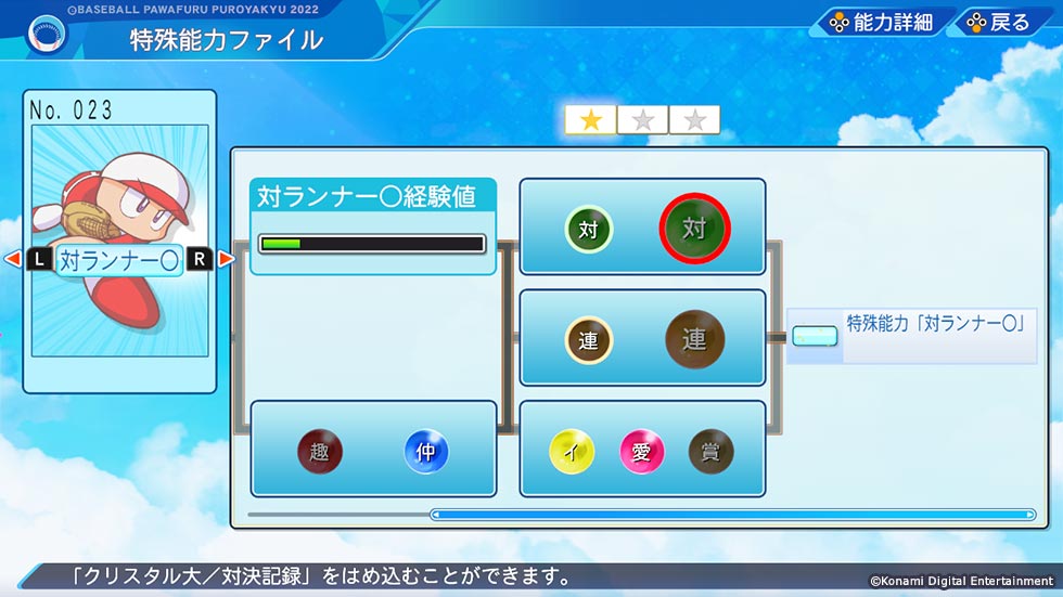 特殊能力のクリア条件に新しくクリスタルが追加されています。前作では専用OB装備品を試合で使わないと経験値がもらえない特殊能力ファイルがありましたが、クリスタルの追加によって特殊能力の獲得のハードルが下がっています。また、クリスタルは趣味、チームメイト、連係練習、愛、シーズン記録等で入手できます。
