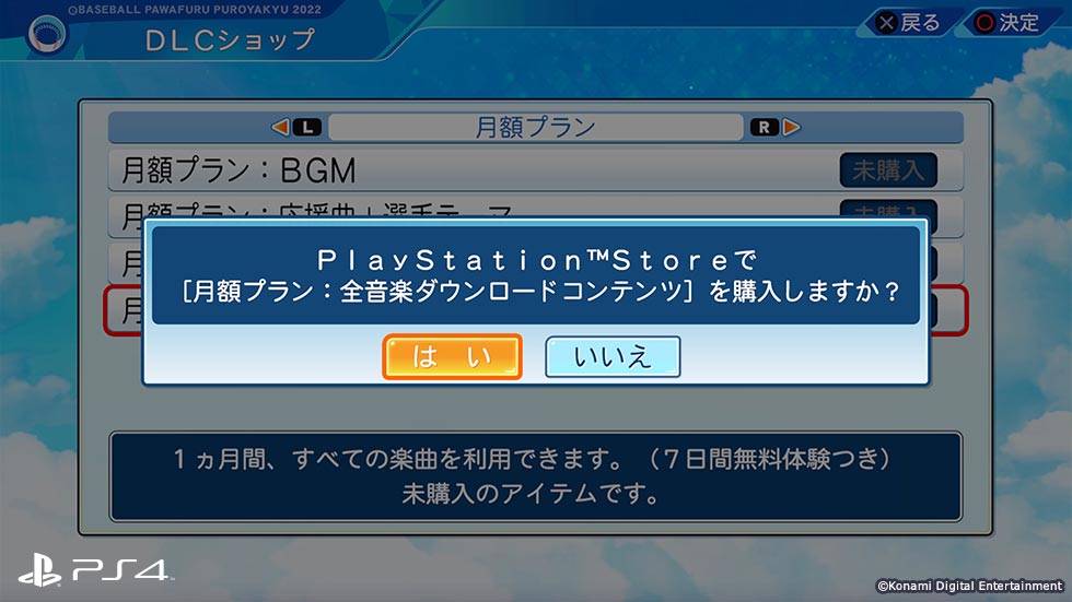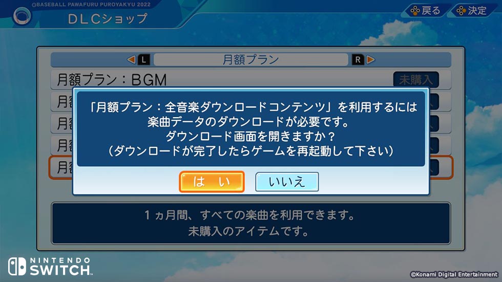 DLCはパワプロゲーム内のパワプロショップから購入できます。PSstore等の各種フォーマットで購入後にパワプロ2022のに戻るとダウンロードのポップアップが表示されるので「はい」を選択しましょう。ダウンロードが完了するとゲーム内に反映されます。