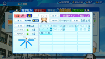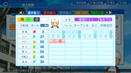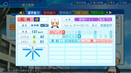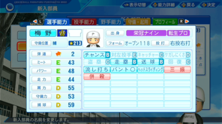 | 弾道 | ミート | パワー | 走力 | 肩力 | 守備力 | 捕球 |