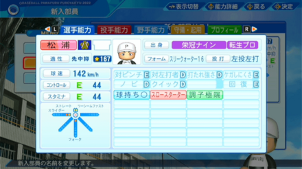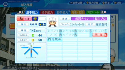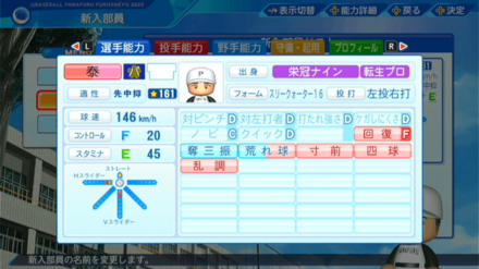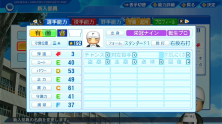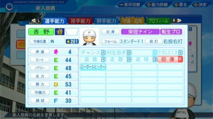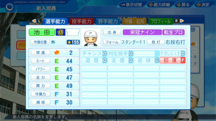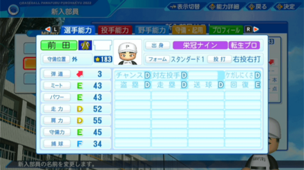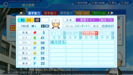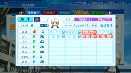 | 弾道 | ミート | パワー | 走力 | 肩力 | 守備力 | 捕球 |