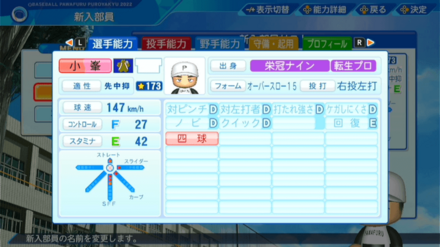 | 奪三振 | 牽制◯ |