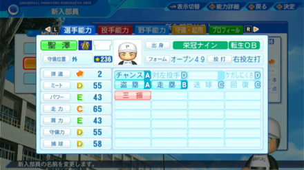| 弾道 | ミート | パワー | 走力 | 肩力 | 守備力 | 捕球 |