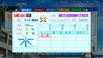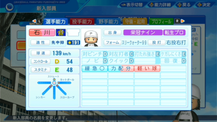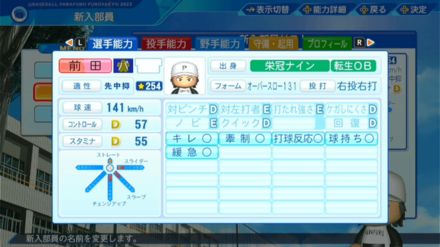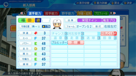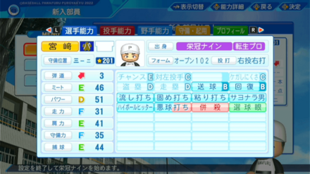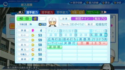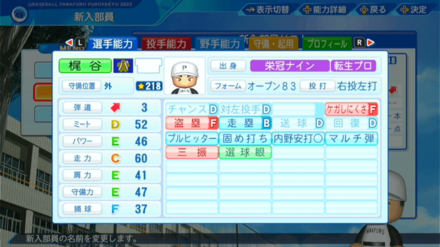 | 弾道 | ミート | パワー | 走力 | 肩力 | 守備力 | 捕球 |